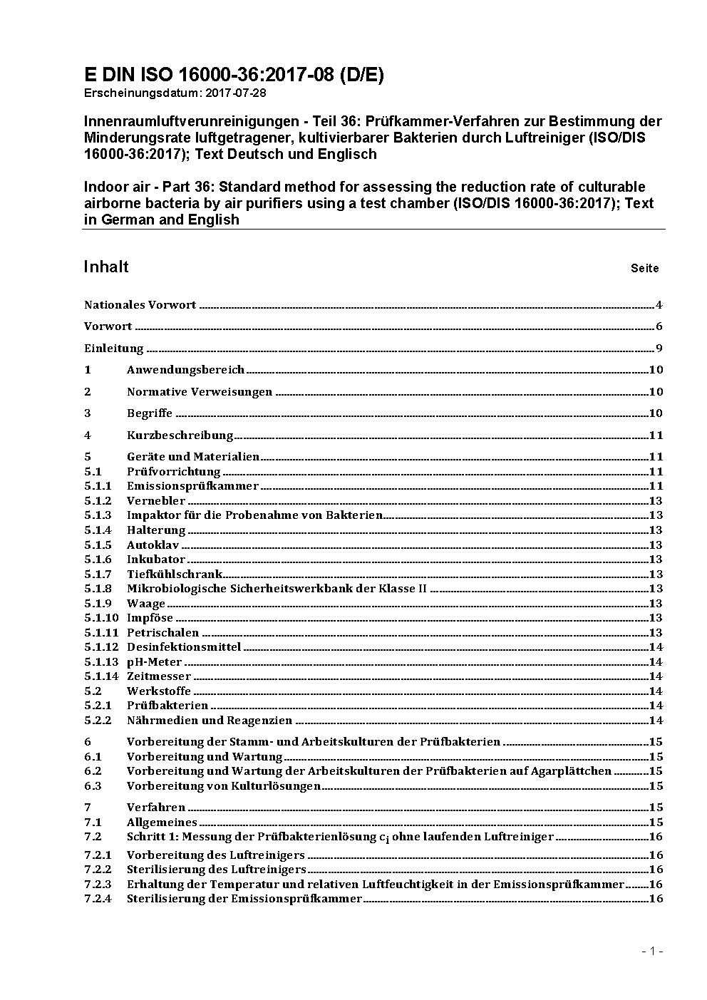 Innenraumluftverunreinigungen - Teil 36: Prüfkammer-Verfahren zur Bestimmung der Minderungsrate luftgetragener, kultivierbarer Bakterien durch Luftreiniger (ISO/DIS 16000-36:2017); Text Deutsch und Englisch