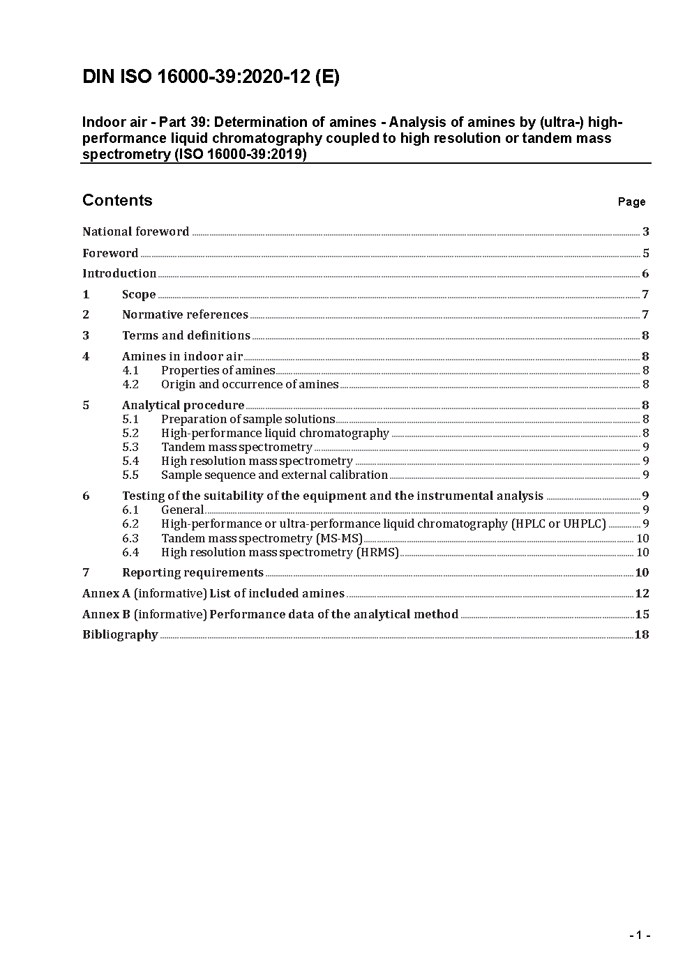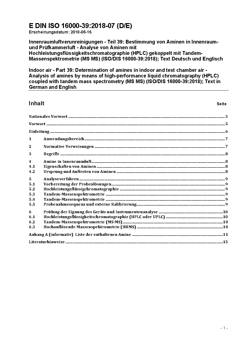 Innenraumluftverunreinigungen - Teil 39: Bestimmung von Aminen in Innenraum- und Prüfkammerluft - Analyse von Aminen mit Hochleistungsflüssigkeitschromatographie (HPLC) gekoppelt mit Tandem-Massenspektrometrie (MS MS) (ISO/DIS 16000-39:2018); Text Deutsch und Englisch