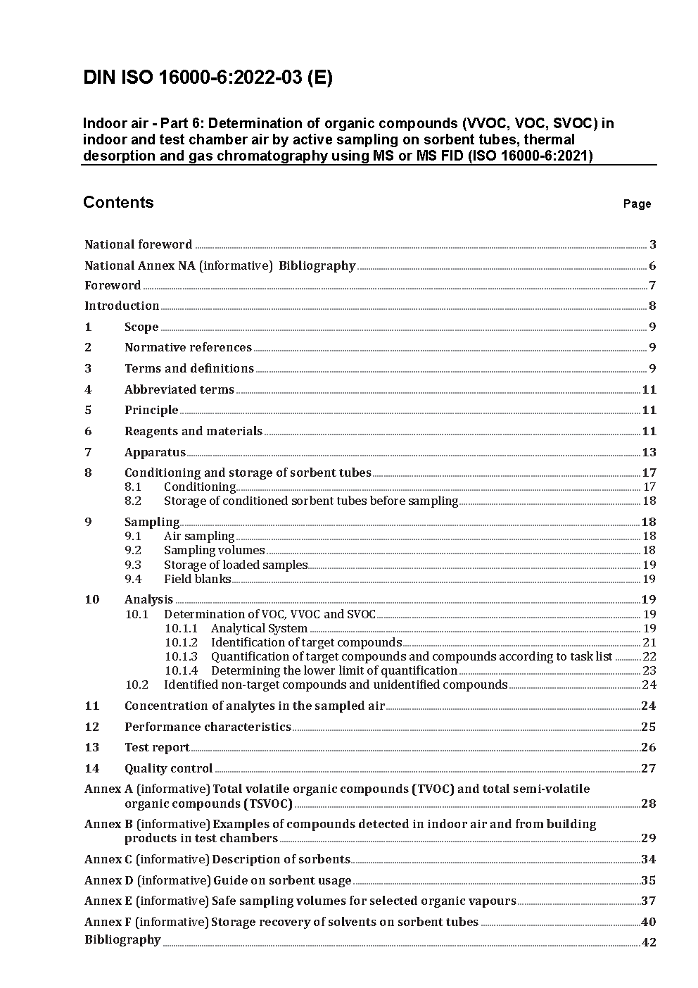 Indoor air - Part 6: Determination of volatile organic compounds in indoor and test chamber air by active sampling on Tenax TA® sorbent, thermal desorption and gas chromatography using MS or MS-FID (ISO 16000-6:2011)