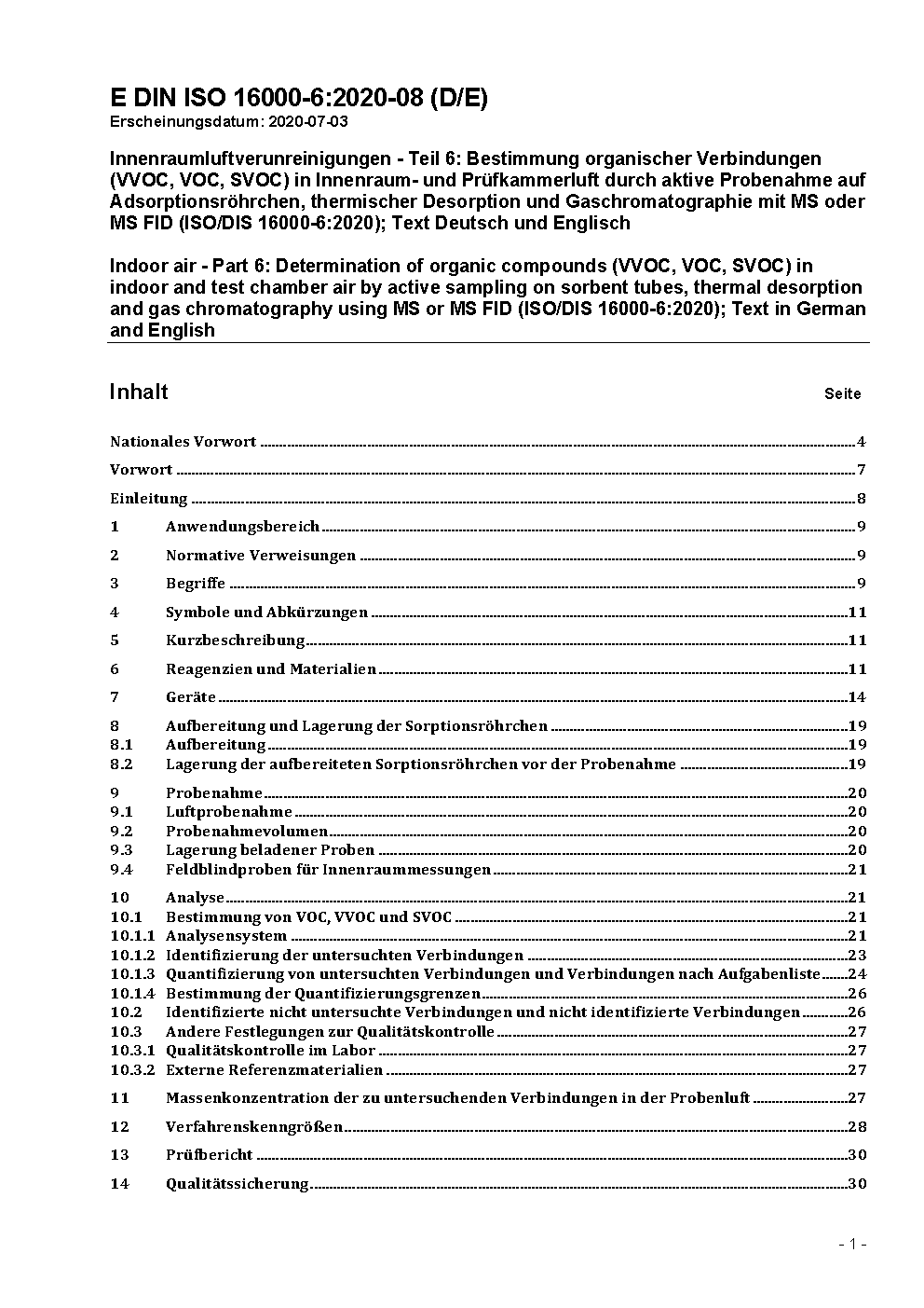 Innenraumluftverunreinigungen - Teil 6: Bestimmung von VOC in der Innenraumluft und in Prüfkammern, Probenahme auf Tenax TA®, thermische Desorption und Gaschromatographie mit MS oder MS-FID (ISO 16000-6:2011)