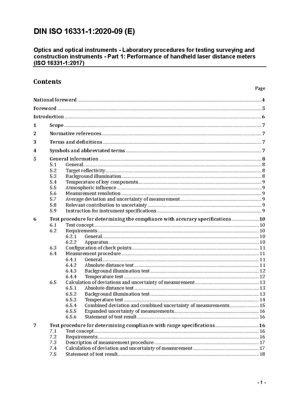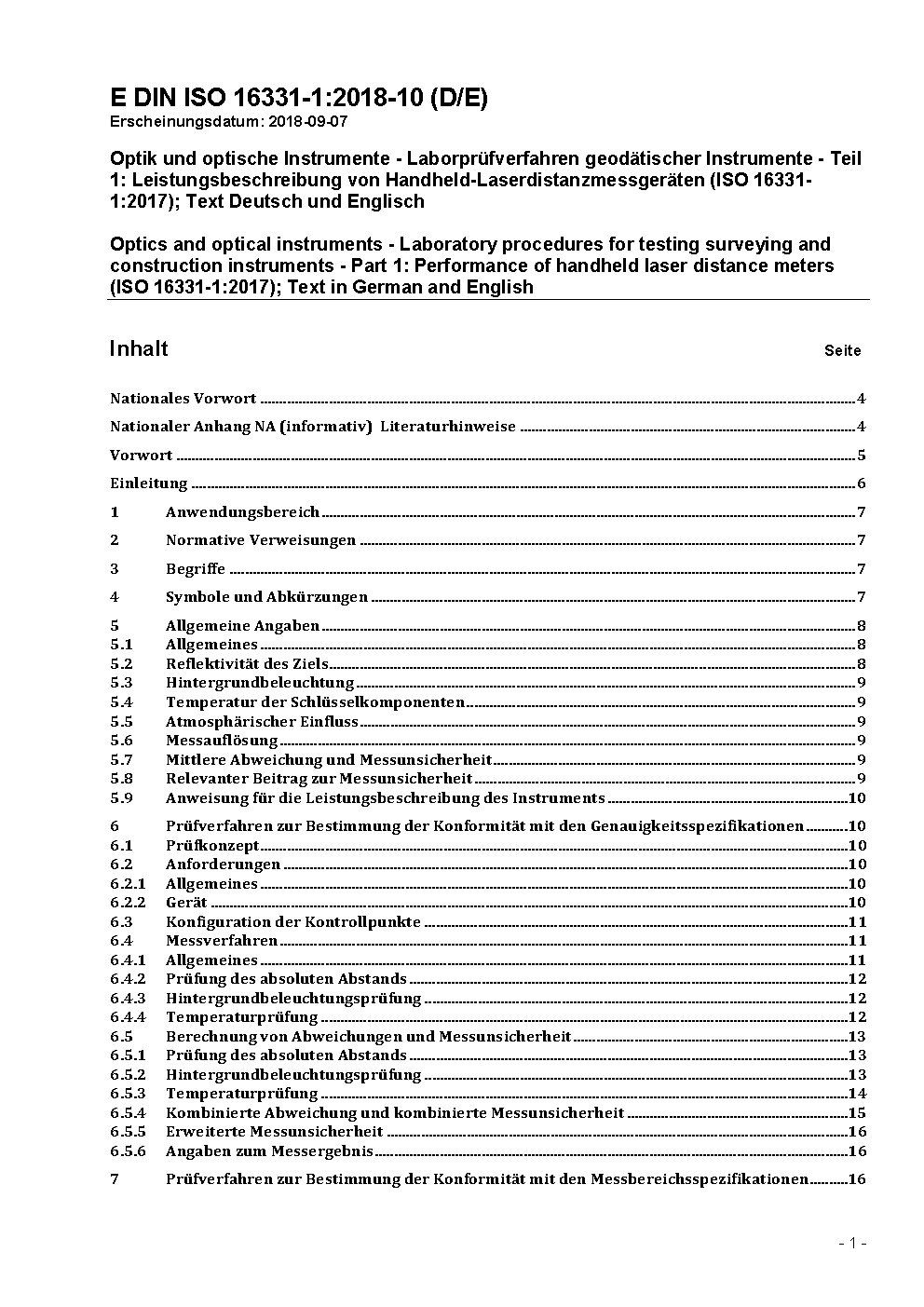 Optik und optische Instrumente - Laborprüfverfahren geodätischer Instrumente - Teil 1: Leistungsbeschreibung von Handheld-Laserdistanzmessgeräten (ISO 16331-1:2017); Text Deutsch und Englisch