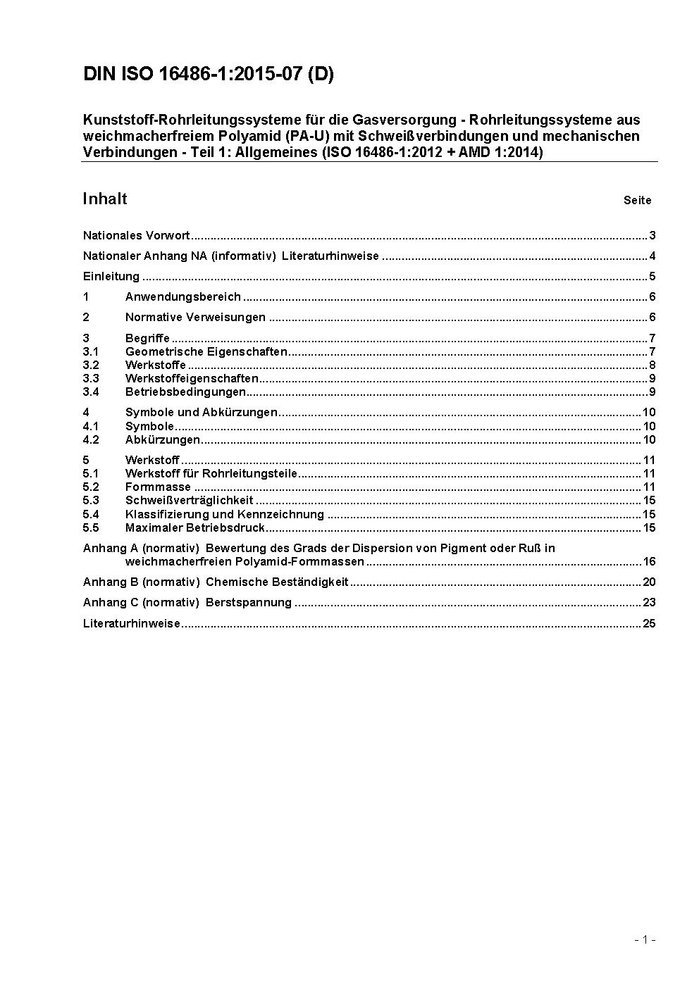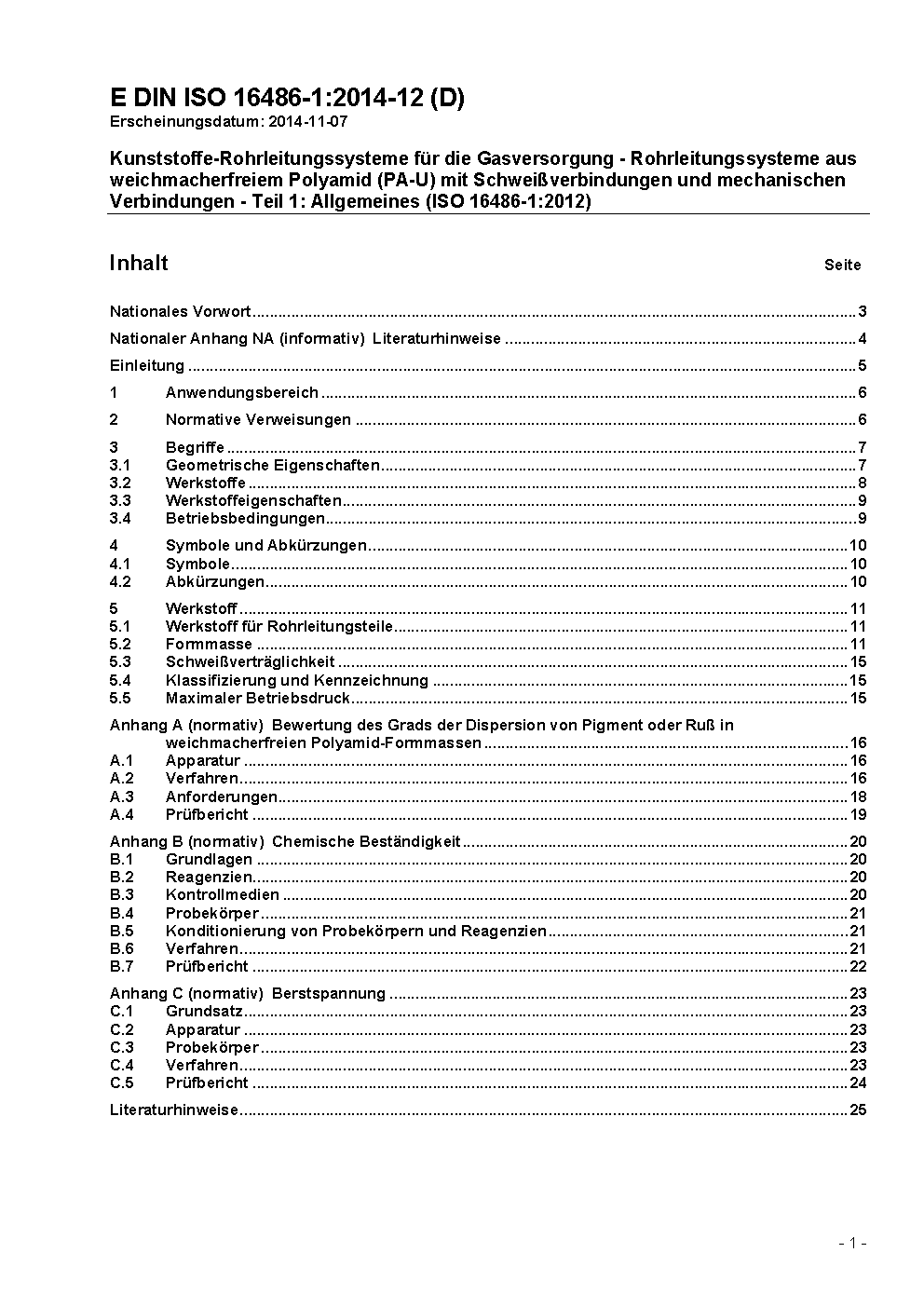 Kunststoffe-Rohrleitungssysteme für die Gasversorgung - Rohrleitungssysteme aus weichmacherfreiem Polyamid (PA-U) mit Schweißverbindungen und mechanischen Verbindungen - Teil 1: Allgemeines (ISO 16486-1:2012)