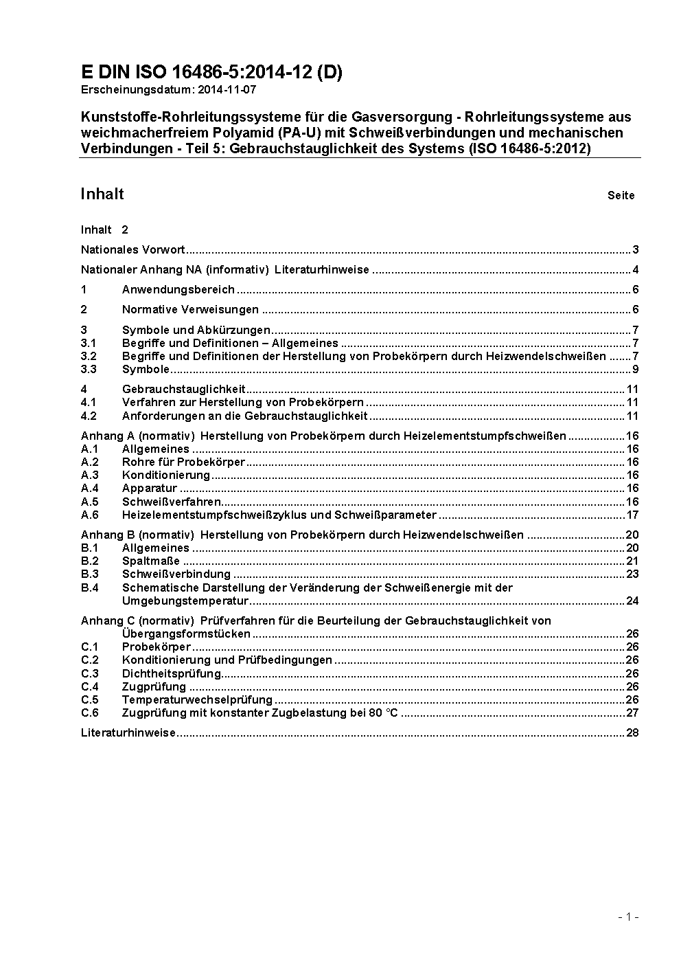 Kunststoffe-Rohrleitungssysteme für die Gasversorgung - Rohrleitungssysteme aus weichmacherfreiem Polyamid (PA-U) mit Schweißverbindungen und mechanischen Verbindungen - Teil 5: Gebrauchstauglichkeit des Systems (ISO 16486-5:2012)