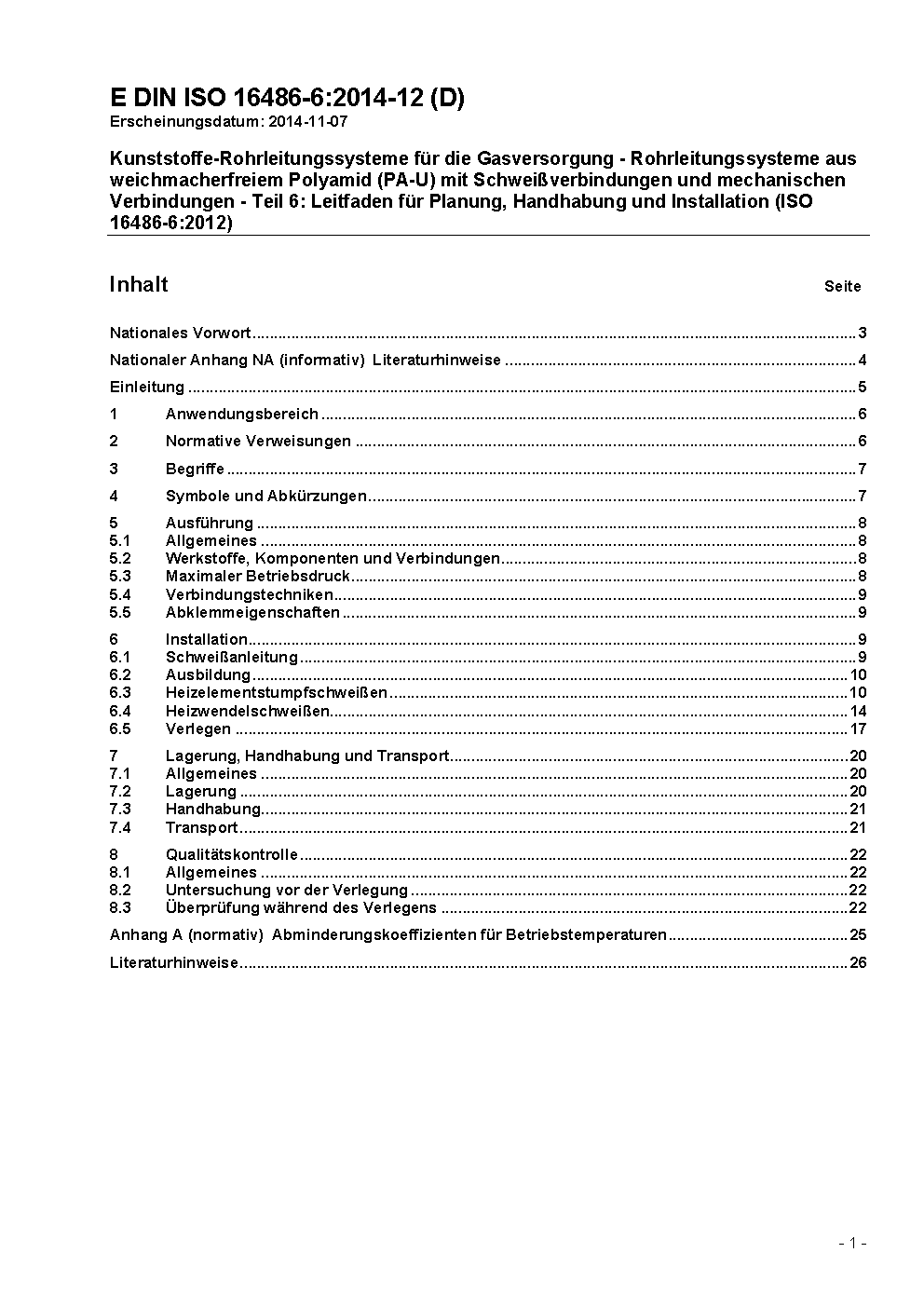 Kunststoff-Rohrleitungssysteme für die Gasversorgung - Rohrleitungssysteme aus weichmacherfreiem Polyamid (PA-U) mit Schweißverbindungen und mechanischen Verbindungen - Teil 6: Leitfaden für Planung, Handhabung und Installation (ISO 16486-6:2012)