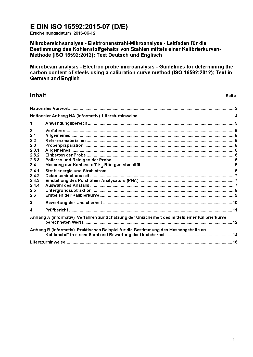 Mikrobereichsanalyse - Elektronenstrahl-Mikroanalyse - Leitfaden für die Bestimmung des Kohlenstoffgehalts von Stählen mittels einer Kalibrierkurven-Methode (ISO 16592:2012); Text Deutsch und Englisch
