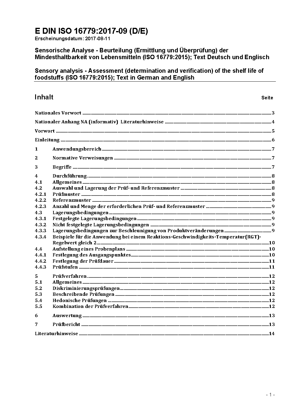 Sensorische Analyse - Beurteilung (Ermittlung und Überprüfung) der Mindesthaltbarkeit von Lebensmitteln (ISO 16779:2015); Text Deutsch und Englisch