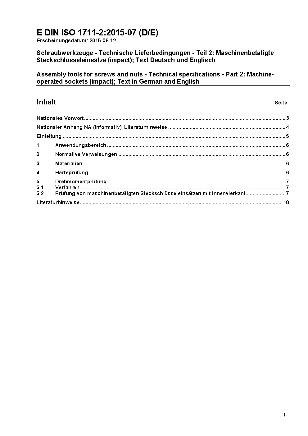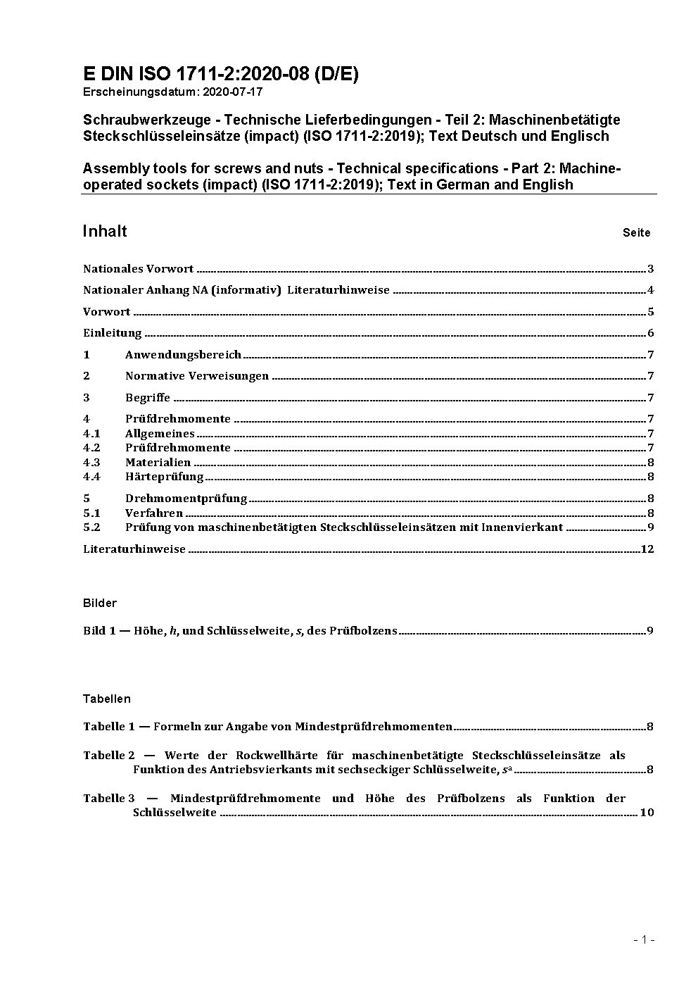 Schraubwerkzeuge - Technische Lieferbedingungen - Teil 2: Maschinenbetätigte Steckschlüsseleinsätze (impact) (ISO 1711-2:2019); Text Deutsch und Englisch