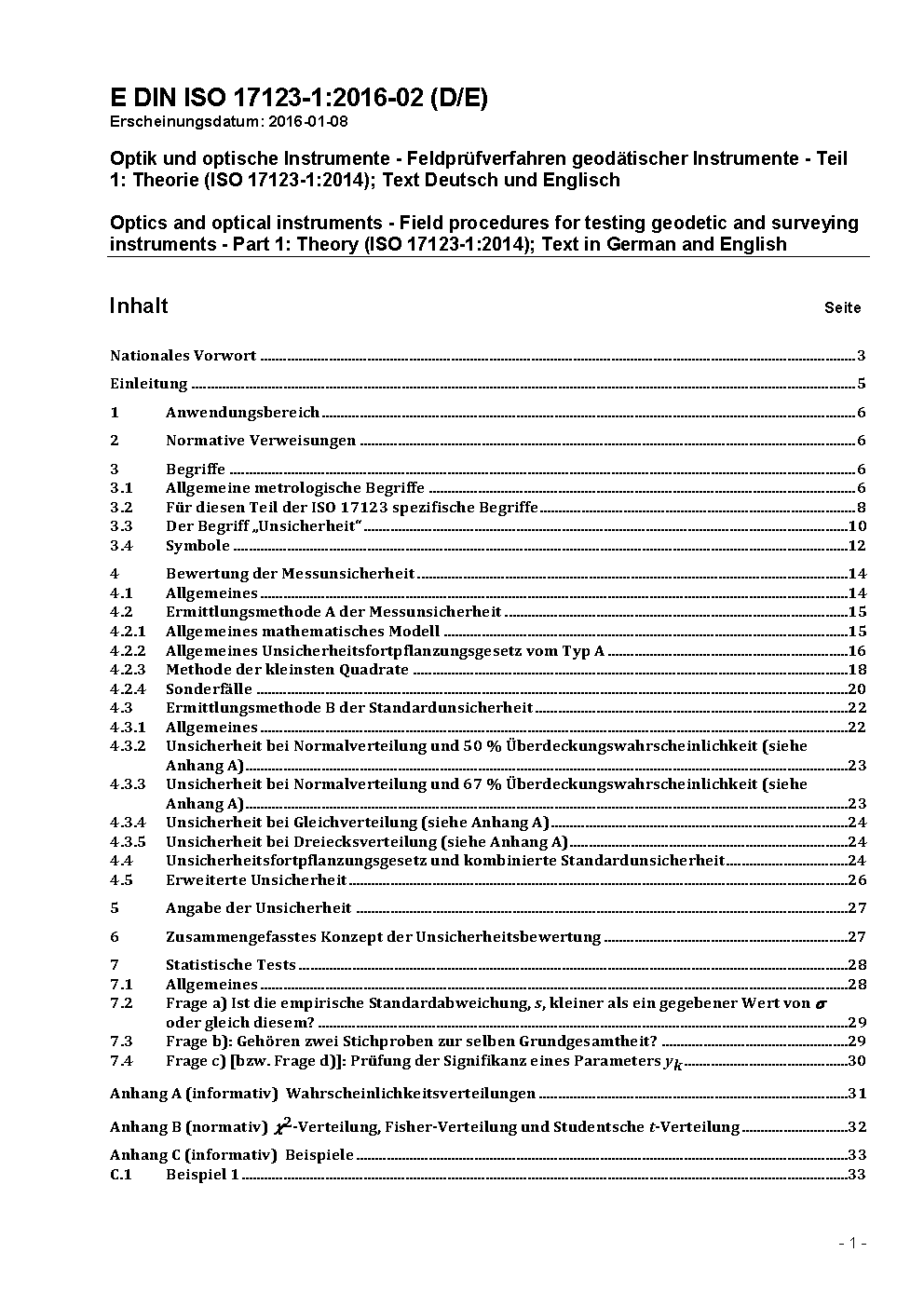 Optik und optische Instrumente - Feldprüfverfahren geodätischer Instrumente - Teil 1: Theorie (ISO 17123-1:2014)