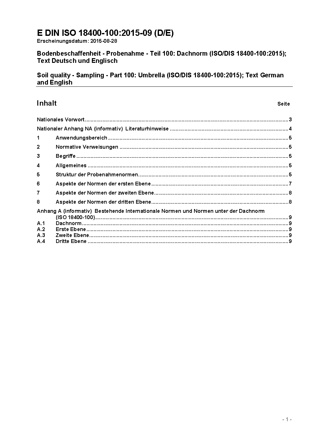 Bodenbeschaffenheit - Probenahme - Teil 100: Dachnorm (ISO/DIS 18400-100:2015); Text Deutsch und Englisch