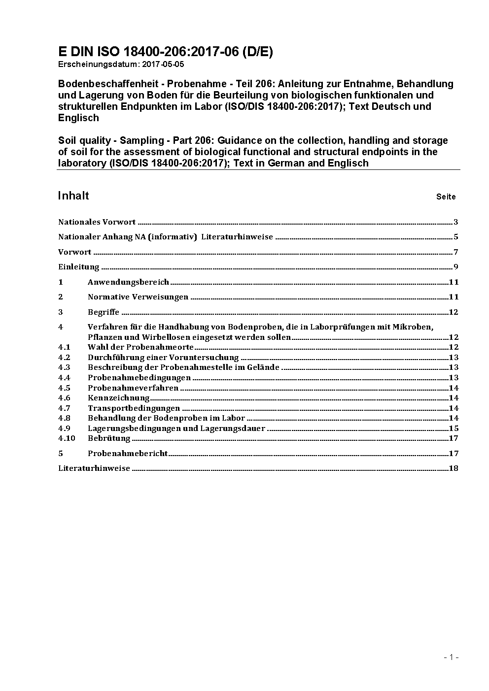 Bodenbeschaffenheit - Probenahme - Teil 206: Entnahme, Behandlung und Lagerung von Boden für die Beurteilung von biologischen funktionalen und strukturellen Endpunkten im Labor (ISO 18400-206:2018)