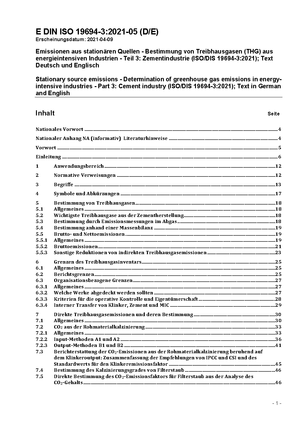 Emissionen aus stationären Quellen - Bestimmung von Treibhausgasen (THG) aus energieintensiven Industrien - Teil 3: Zementindustrie (ISO/DIS 19694-3:2021); Text Deutsch und Englisch