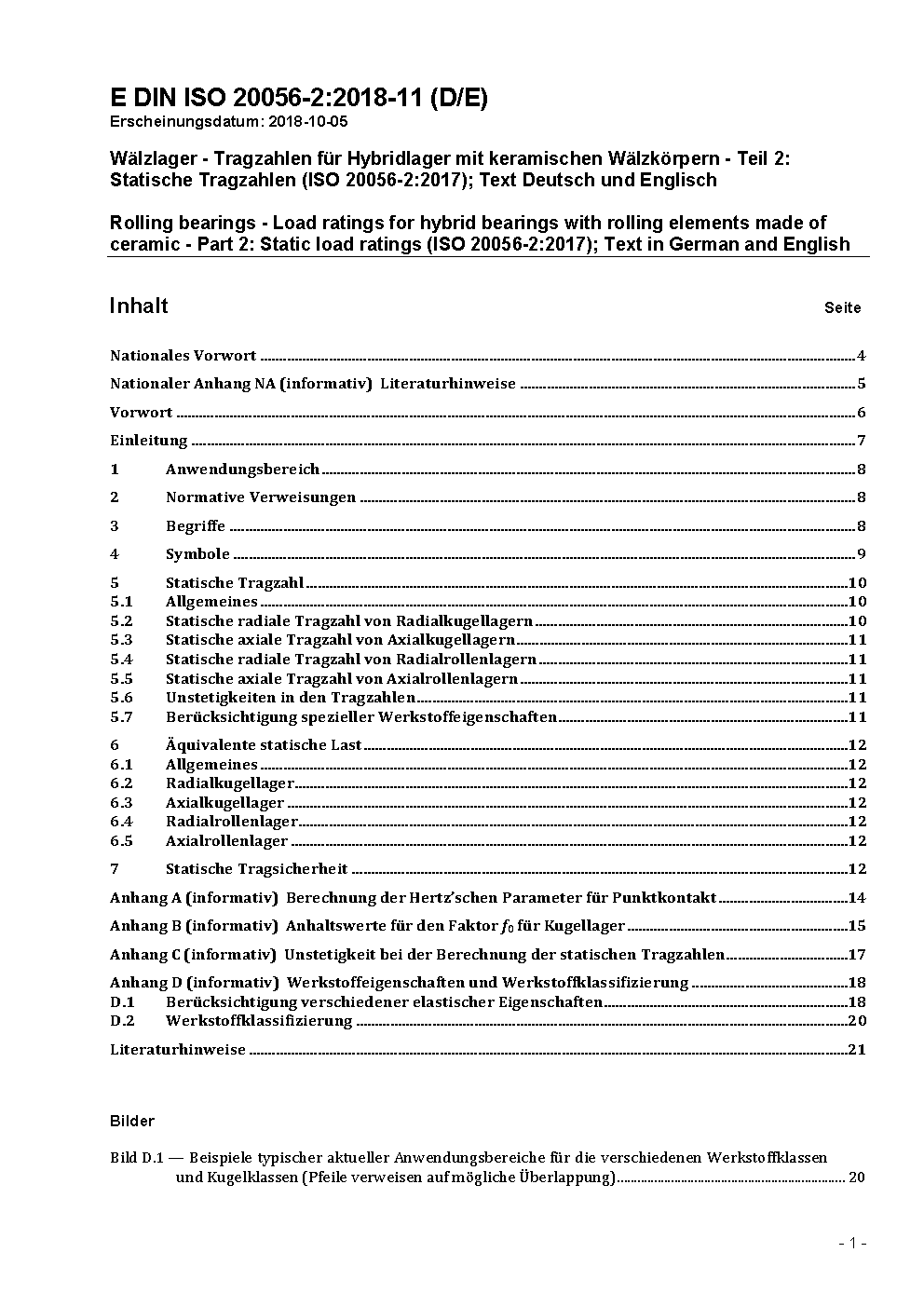 Wälzlager - Tragzahlen für Hybridlager mit keramischen Wälzkörpern - Teil 2: Statische Tragzahlen (ISO 20056-2:2017); Text Deutsch und Englisch