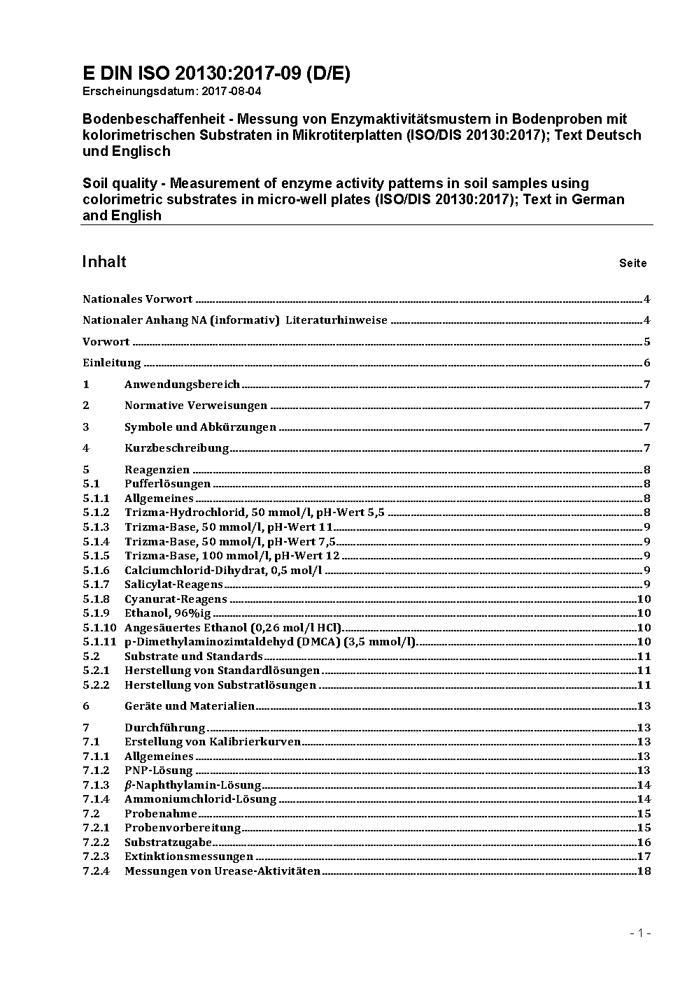 Bodenbeschaffenheit - Messung von Enzymaktivitätsmustern in Bodenproben mit kolorimetrischen Substraten in Mikrotiterplatten (ISO/DIS 20130:2017); Text Deutsch und Englisch