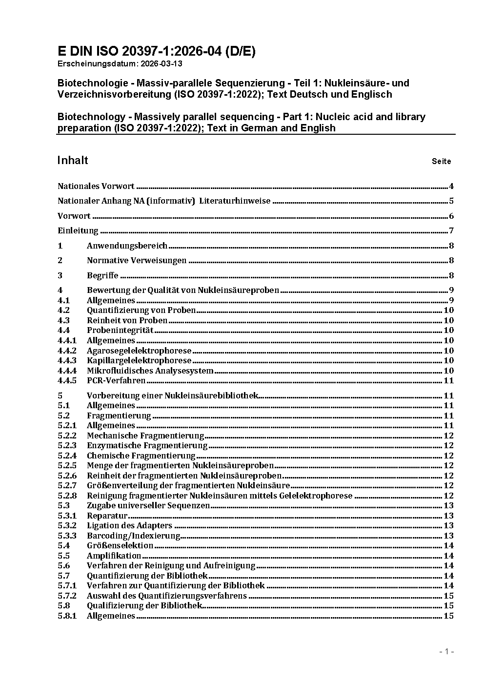 Biotechnology - Massively parallel sequencing - Part 1: Nucleic acid and library preparation (ISO 20397-1:2022); Text in German and English