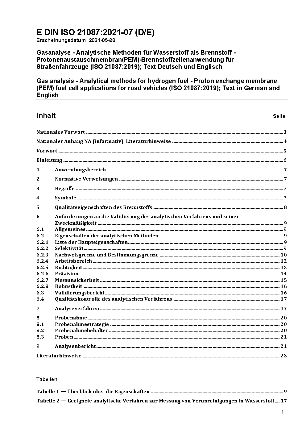 Gasanalyse - Analytische Methoden für Wasserstoff als Kraftstoff - Protonenaustauschmembran(PEM)-Brennstoffzellenanwendung für Straßenfahrzeuge (ISO 21087:2019)