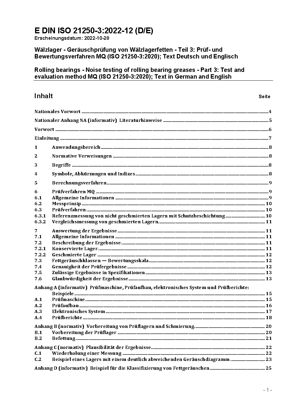 Wälzlager - Geräuschprüfung von Wälzlagerfetten - Teil 3: Prüf- und Bewertungsverfahren MQ (ISO 21250-3:2020) / Achtung: Gilt in Verbindung mit DIN ISO 21250-1 (2023-09)
