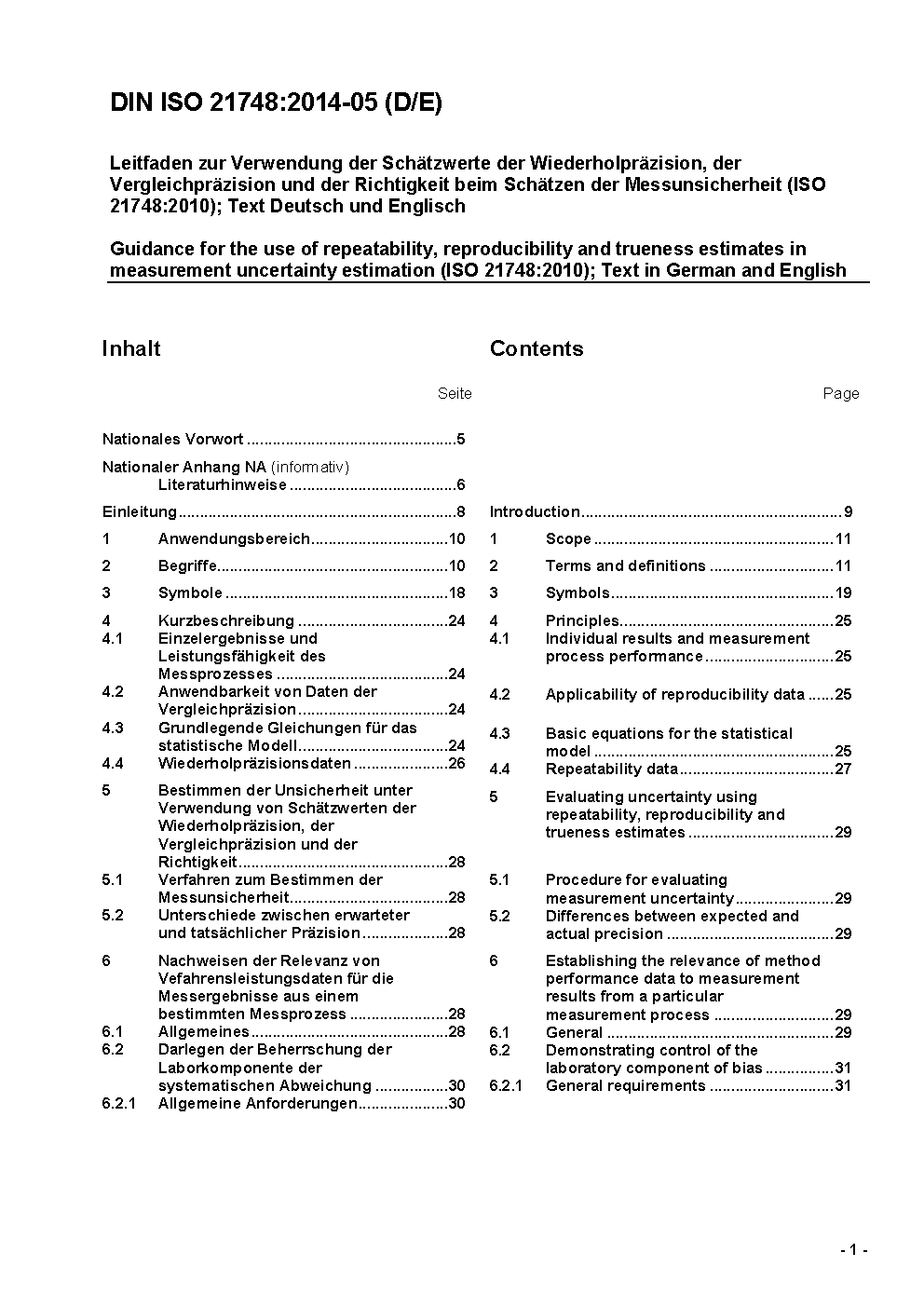 Guidance for the use of repeatability, reproducibility and trueness estimates in measurement uncertainty estimation (ISO 21748:2010); Text in German and English