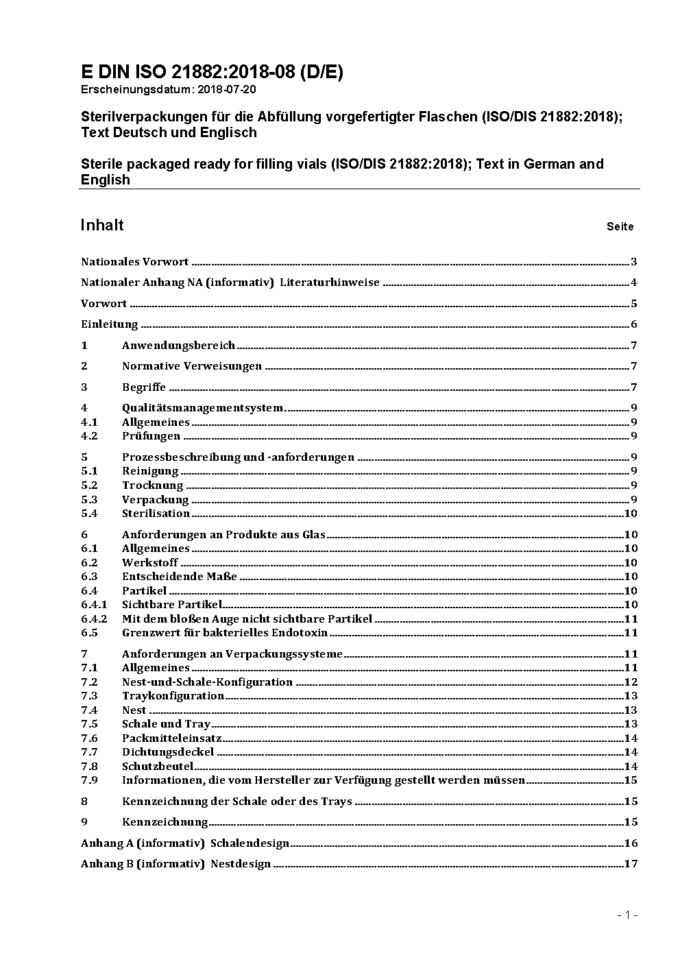 Sterilverpackungen für die Abfüllung vorgefertigter Flaschen (ISO/DIS 21882:2018); Text Deutsch und Englisch