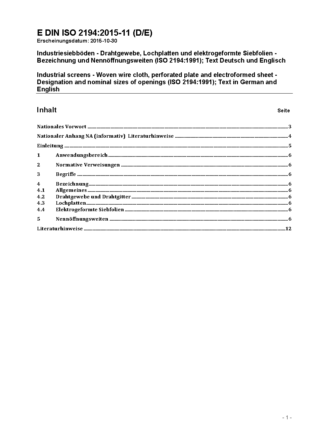 Industrial screens - Woven wire cloth, perforated plate and electroformed sheet - Designation and nominal sizes of openings (ISO 2194:1991); Text in German and English