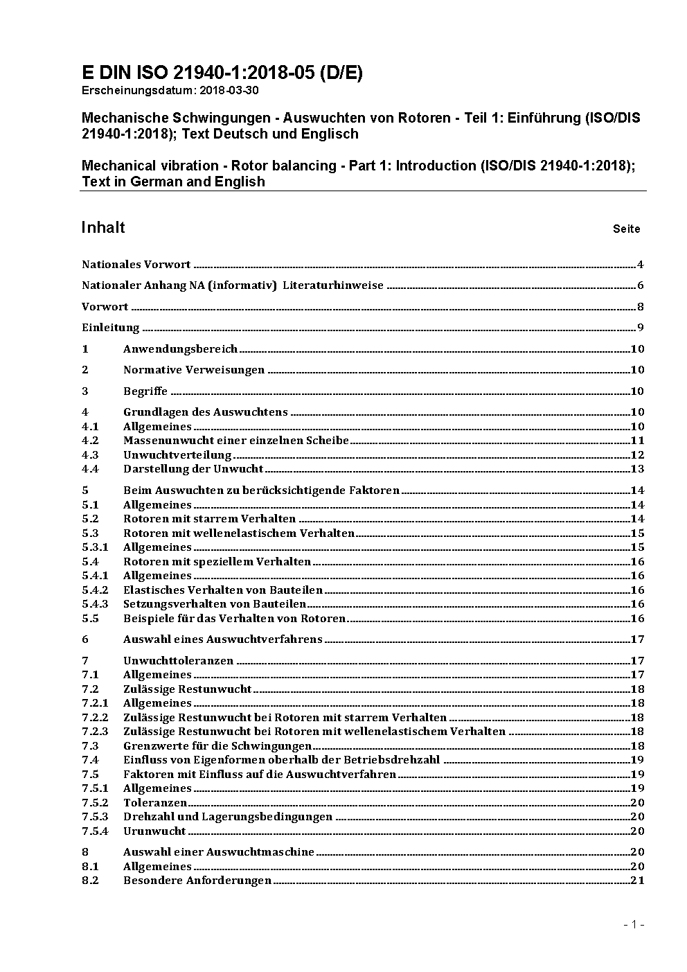 Mechanische Schwingungen - Auswuchten von Rotoren - Teil 1: Einführung (ISO/DIS 21940-1:2018); Text Deutsch und Englisch
