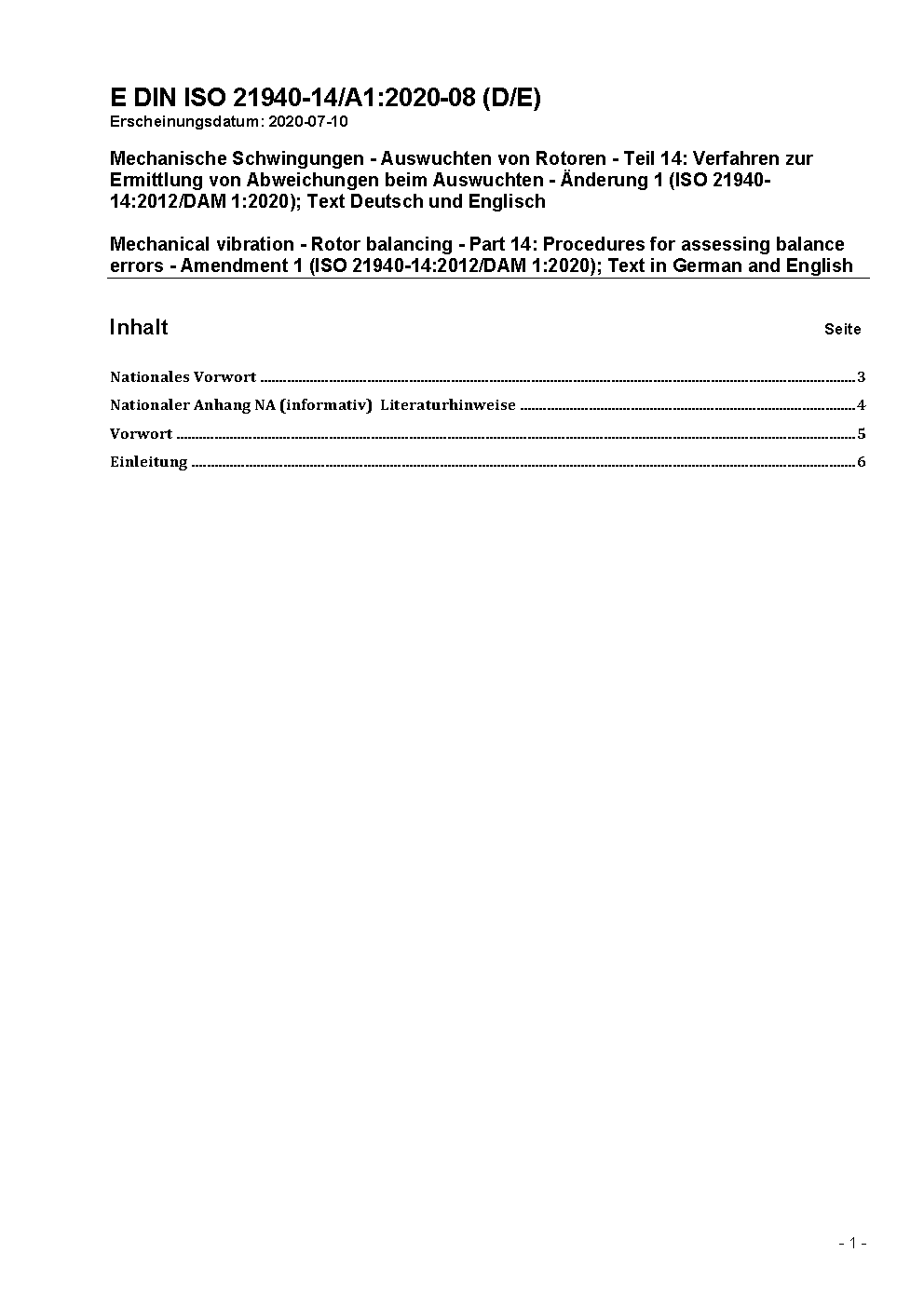 Mechanische Schwingungen - Auswuchten von Rotoren - Teil 14: Verfahren zur Ermittlung von Abweichungen beim Auswuchten - Änderung 1 (ISO 21940-14:2012/DAM 1:2020); Text Deutsch und Englisch
