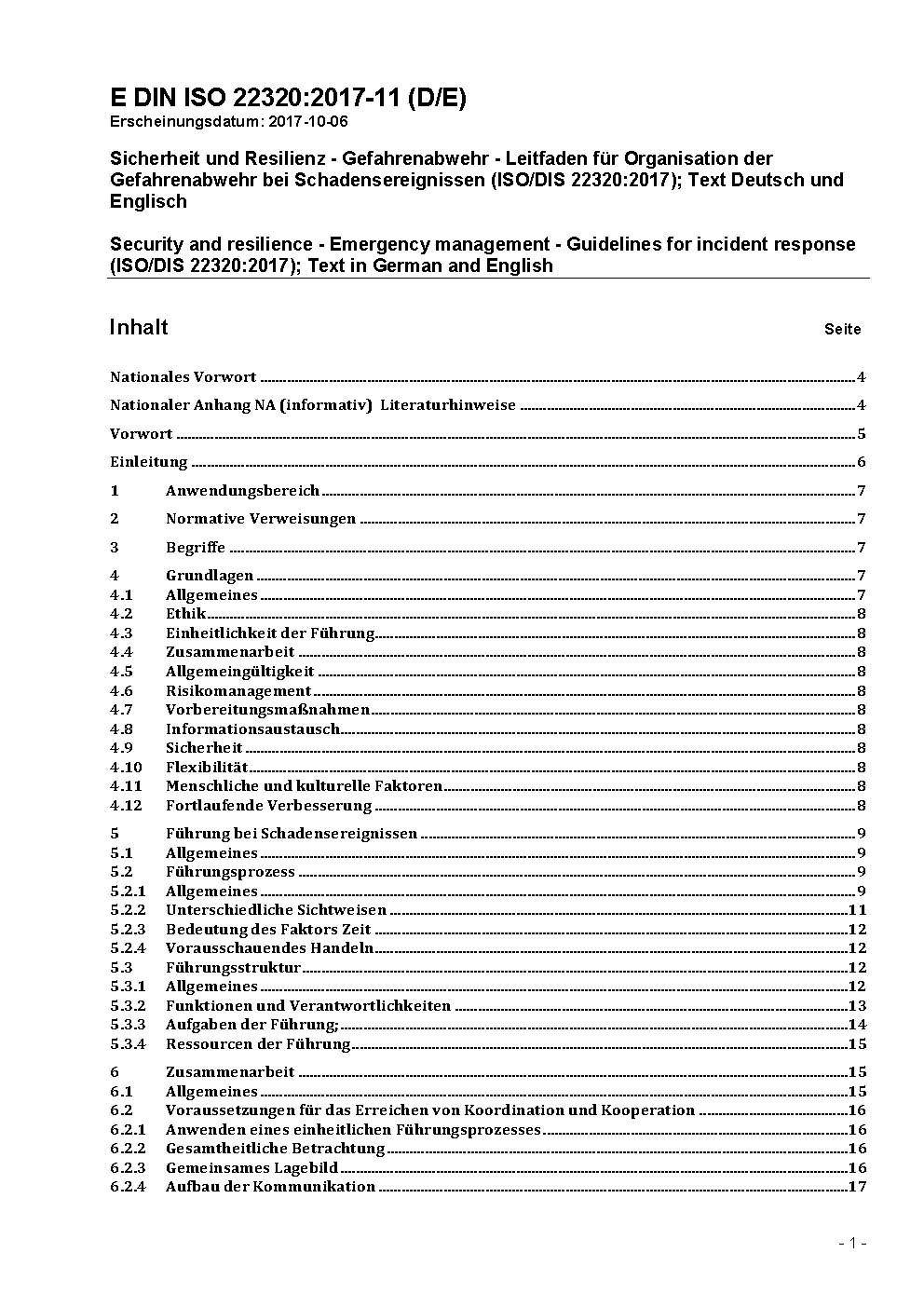 Sicherheit und Resilienz - Gefahrenabwehr - Leitfaden für die Organisation der Gefahrenabwehr bei Schadensereignissen (ISO 22320:2018)