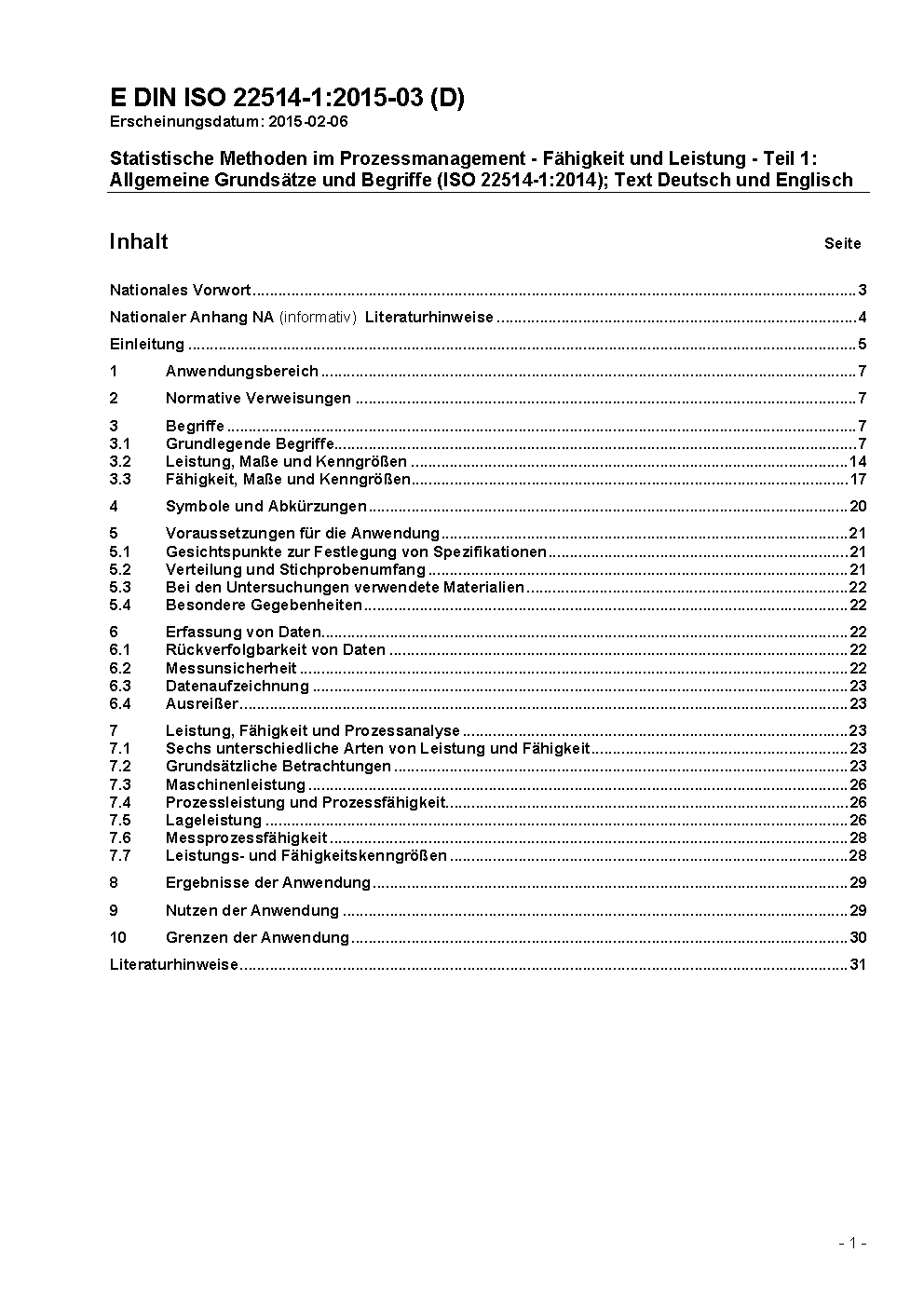 Statistische Methoden im Prozessmanagement - Fähigkeit und Leistung - Teil 1: Allgemeine Grundsätze und Begriffe (ISO 22514-1:2014); Text Deutsch und Englisch