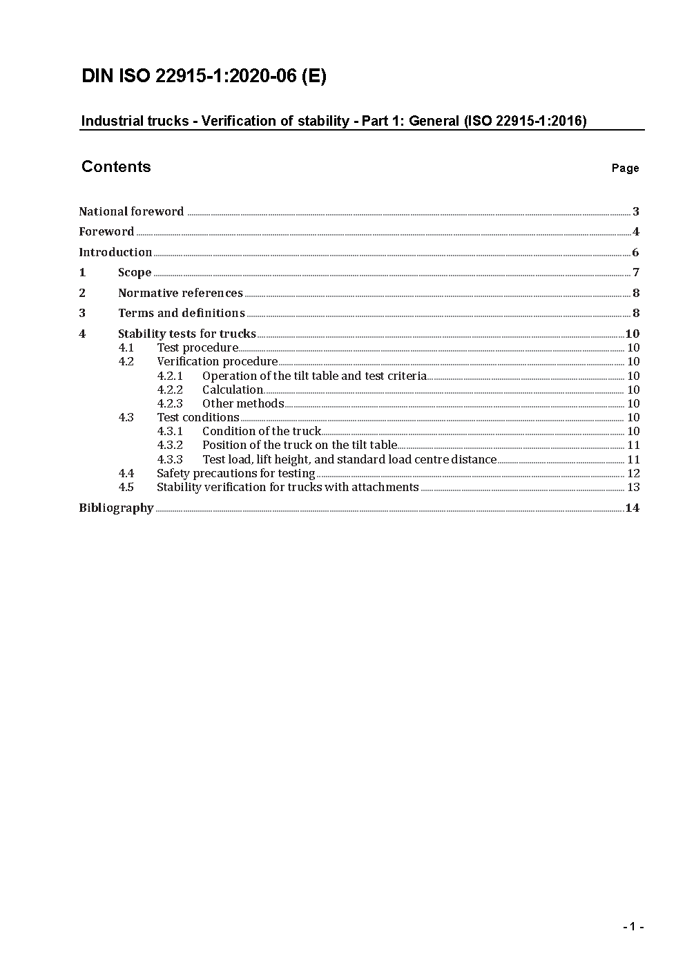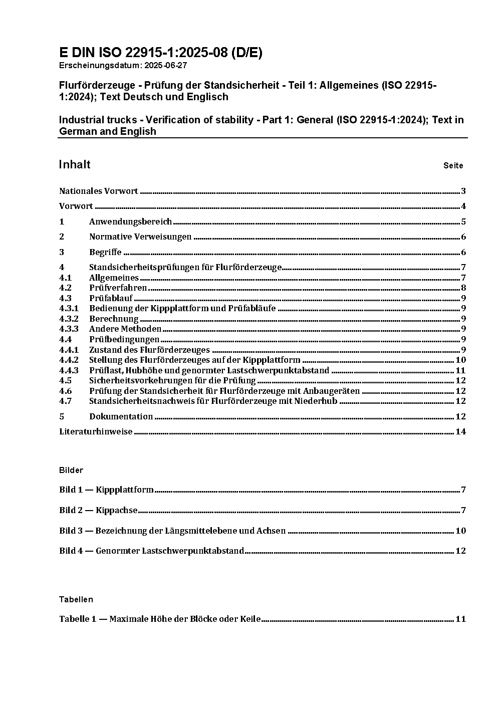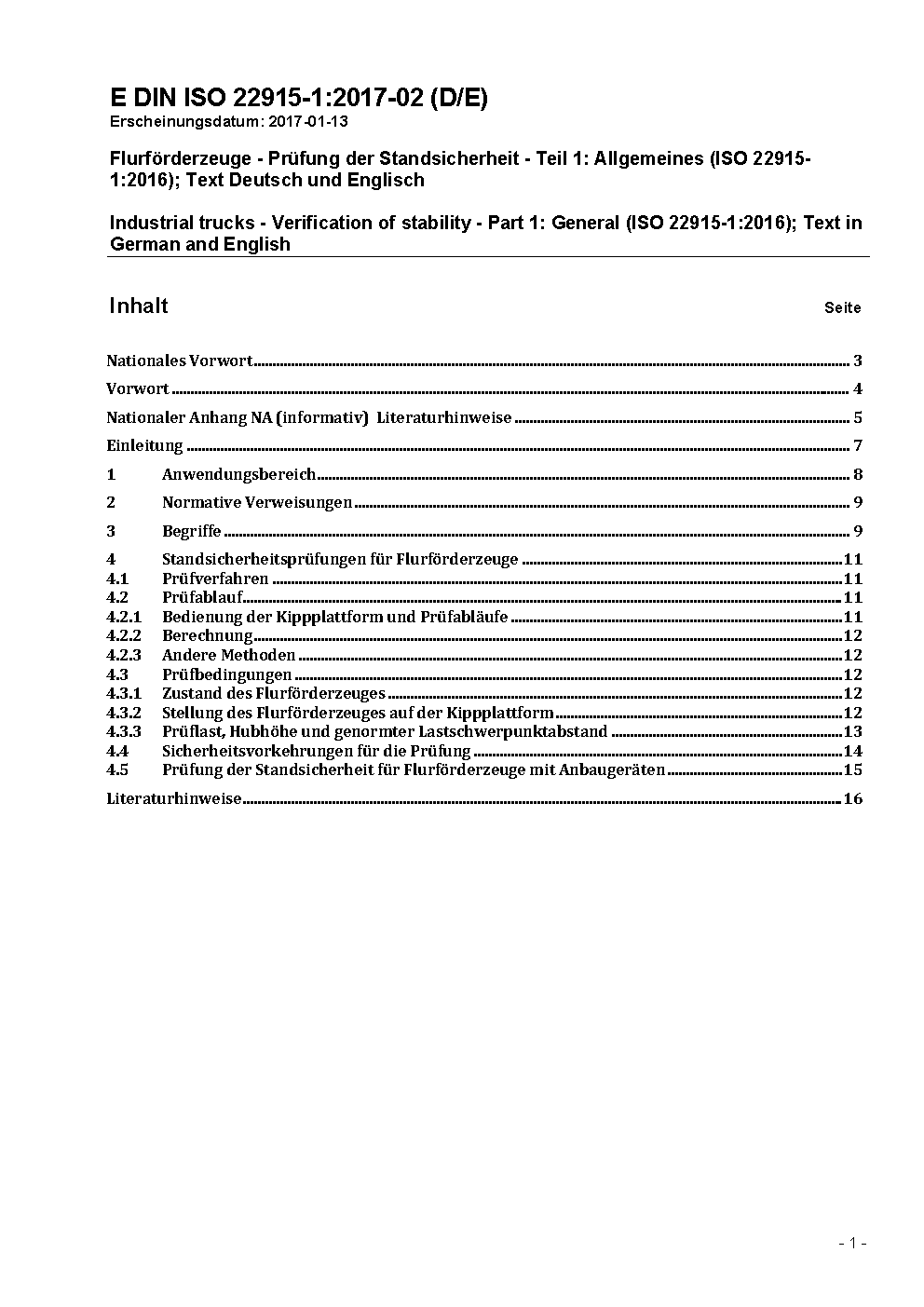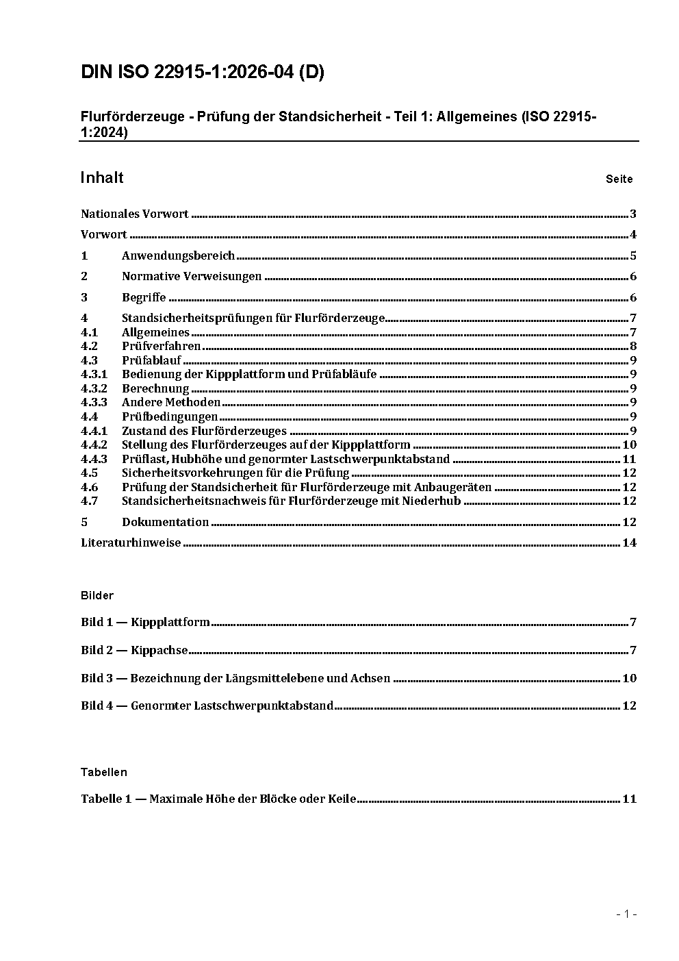 Flurförderzeuge - Prüfung der Standsicherheit - Teil 1: Allgemeines (ISO 22915-1:2024)