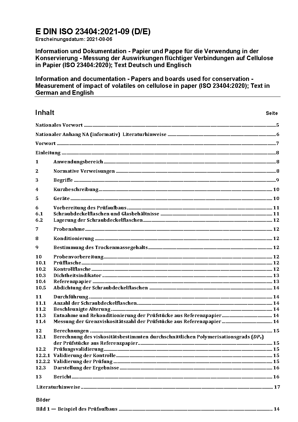 Information und Dokumentation - Papier und Pappe für die Verwendung in der Konservierung - Messung der Auswirkungen flüchtiger Verbindungen auf Cellulose in Papier (ISO 23404:2020)