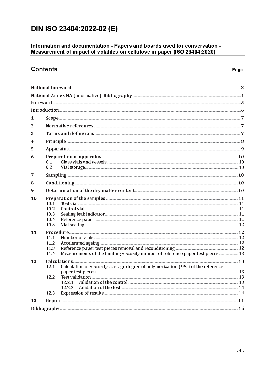 Information and documentation - Papers and boards used for conservation - Measurement of impact of volatiles on cellulose in paper (ISO 23404:2020)