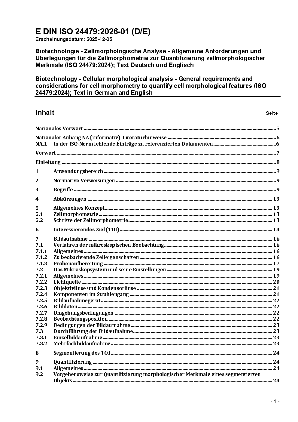 Biotechnologie - Zellmorphologische Analyse - Allgemeine Anforderungen und Überlegungen für die Zellmorphometrie zur Quantifizierung zellmorphologischer Merkmale (ISO 24479:2024); Text Deutsch und Englisch