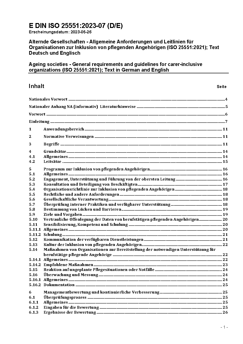 Alternde Gesellschaften - Allgemeine Anforderungen und Leitlinien für Organisationen zur Inklusion von pflegenden Angehörigen (ISO 25551:2021)