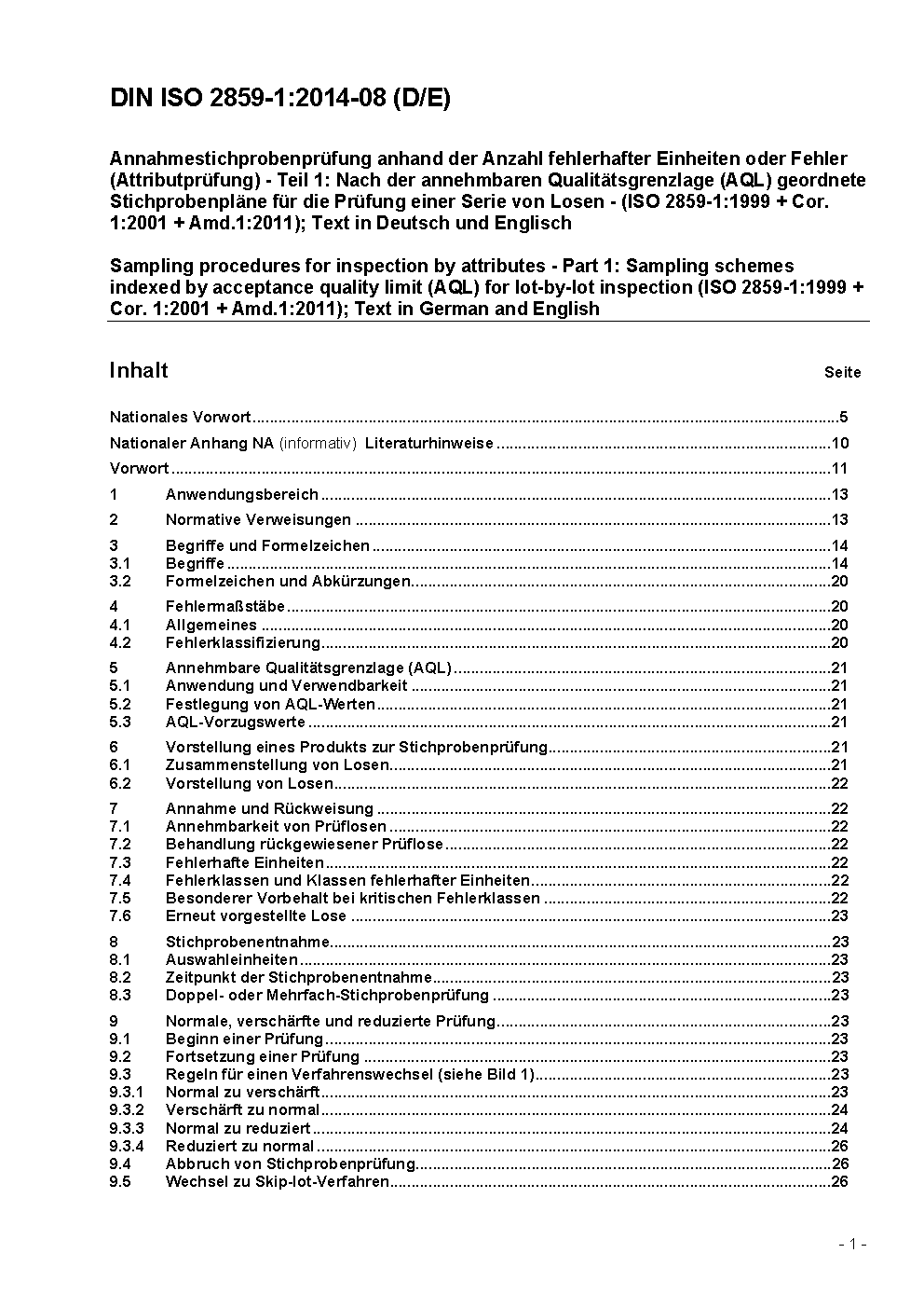 Sampling procedures for inspection by attributes - Part 1: Sampling schemes indexed by acceptance quality limit (AQL) for lot-by-lot inspection (ISO 2859-1:1999 + Cor. 1:2001 + Amd.1:2011); Text in German and English