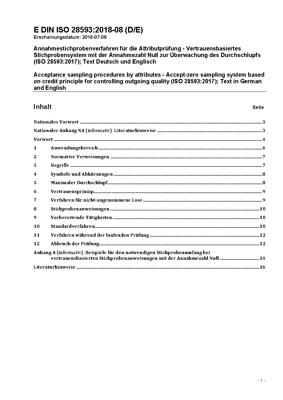 Annahmestichprobenverfahren für die Attributprüfung - Vertrauensbasiertes Stichprobensystem mit der Annahmezahl Null zur Überwachung des Durchschlupfs (ISO 28593:2017); Text Deutsch und Englisch
