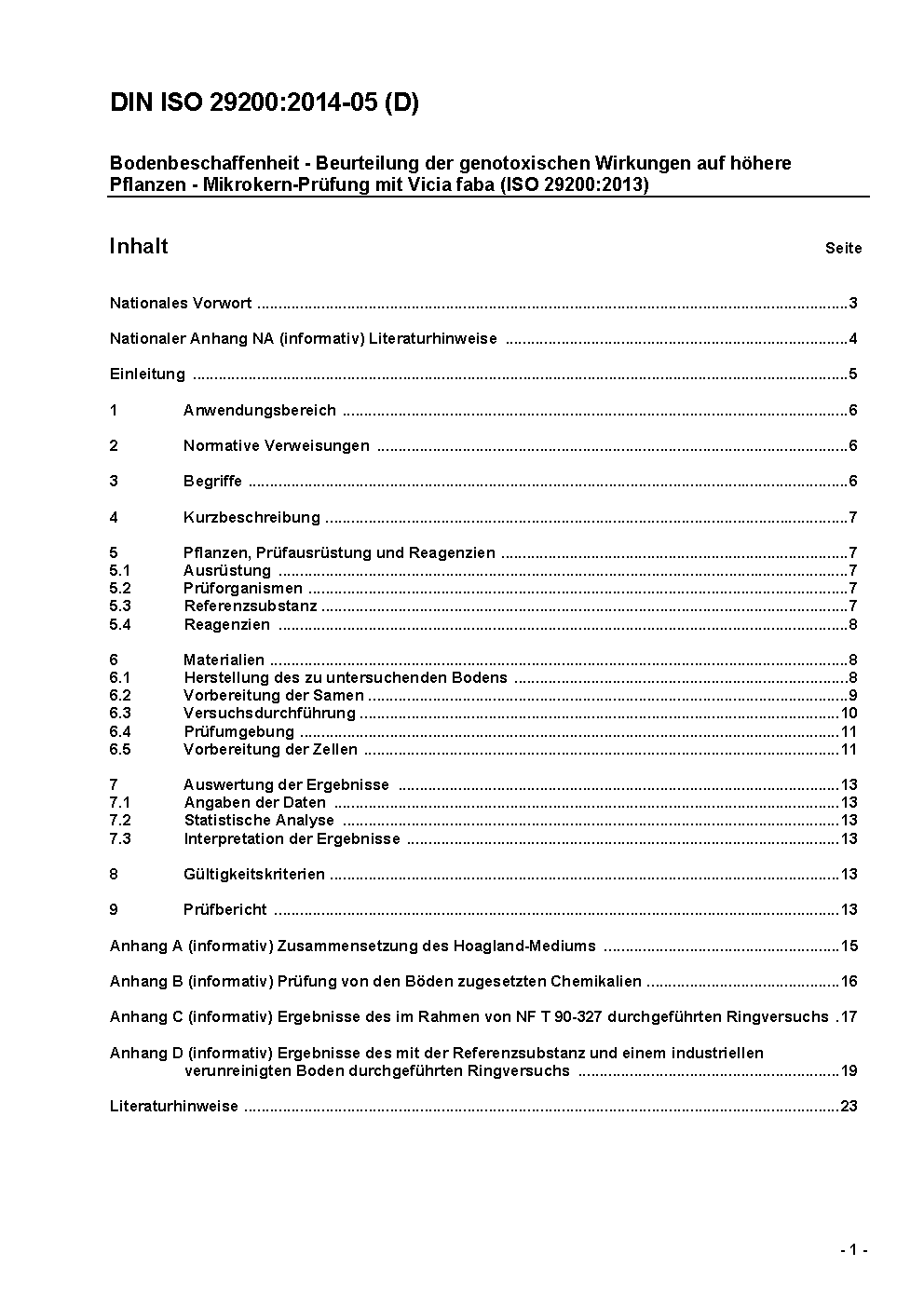 Bodenbeschaffenheit - Beurteilung der genotoxischen Wirkungen auf höhere Pflanzen - Mikrokern-Prüfung mit Vicia faba (ISO 29200:2013)