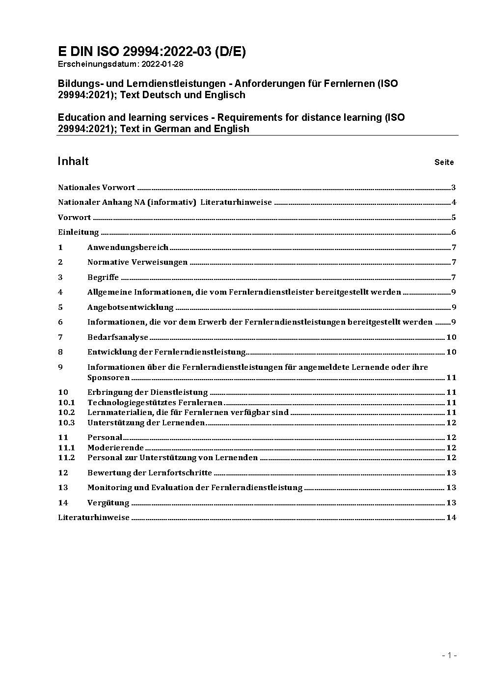 Bildungs- und Lerndienstleistungen - Anforderungen für Fernlernen (ISO 29994:2021)