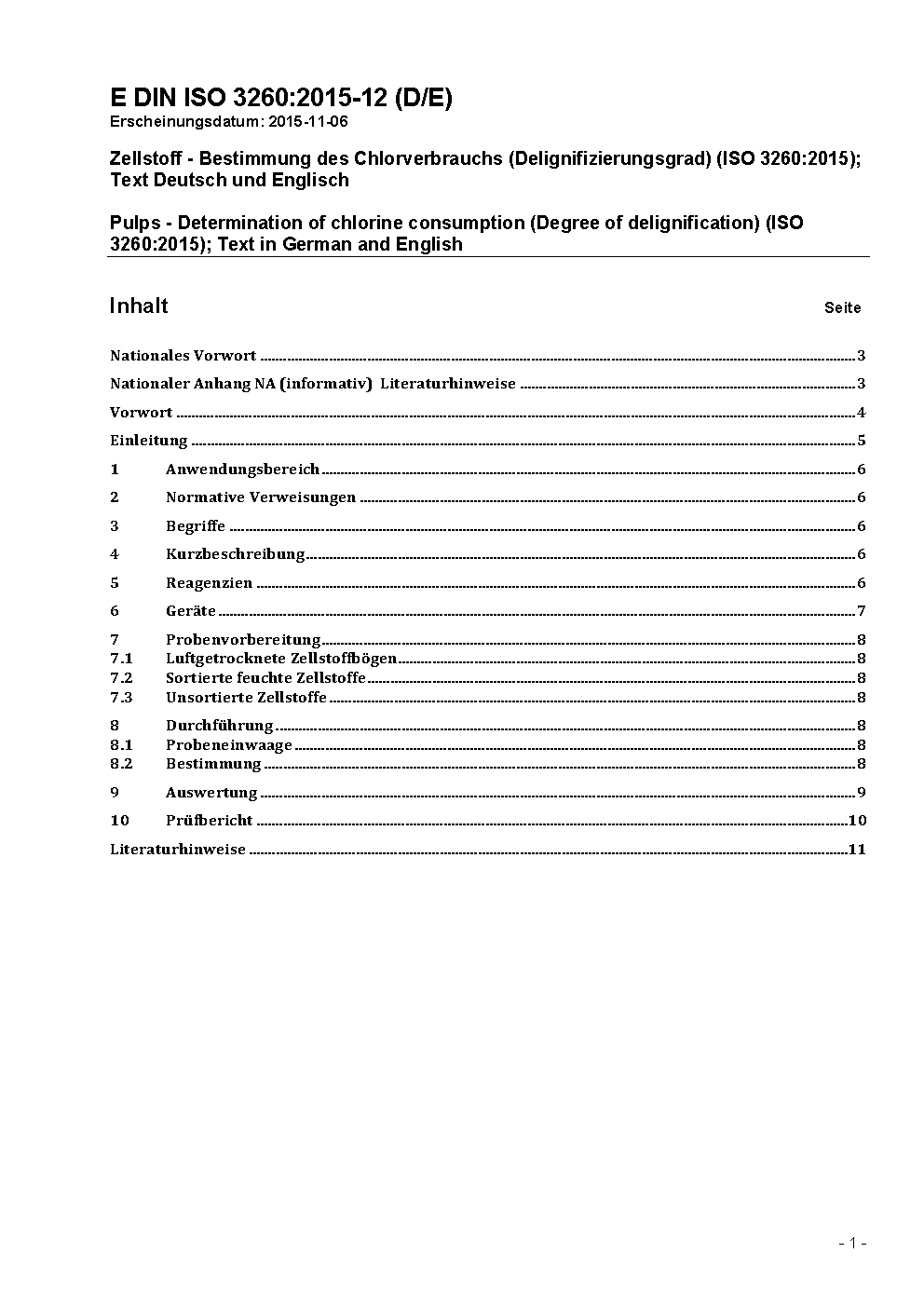 Zellstoff - Bestimmung des Chlorverbrauchs (Delignifizierungsgrad) (ISO 3260:2015)