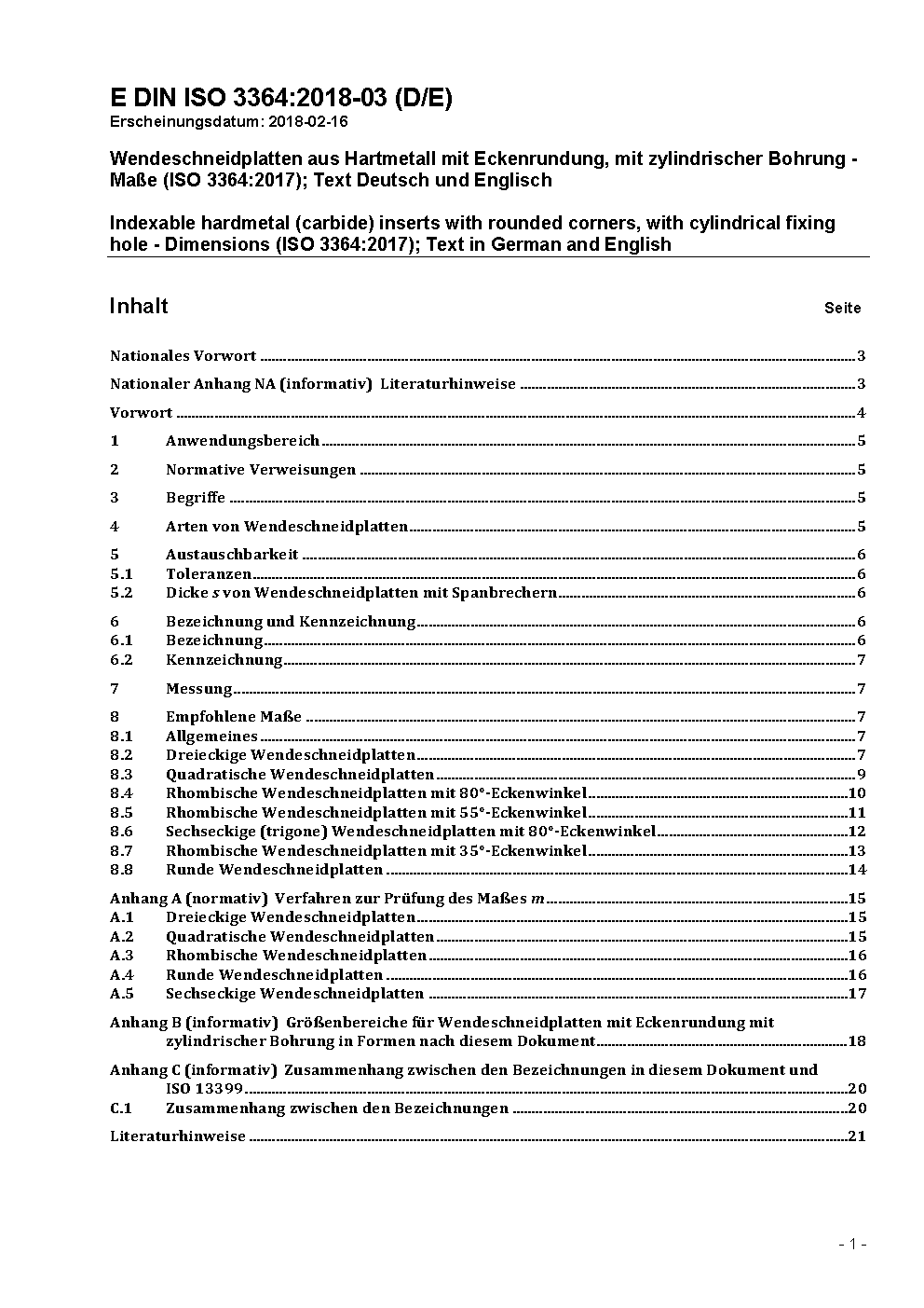 Wendeschneidplatten aus Hartmetall mit Eckenrundung, mit zylindrischer Bohrung - Maße (ISO 3364:2017); Text Deutsch und Englisch
