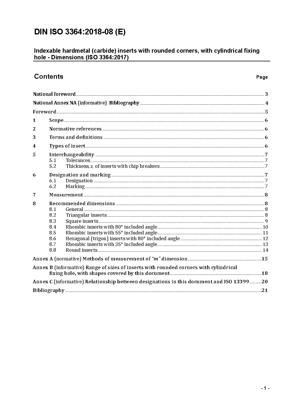 Indexable hardmetal (carbide) inserts with rounded corners, with cylindrical fixing hole - Dimensions (ISO 3364:2017); Text in German and English