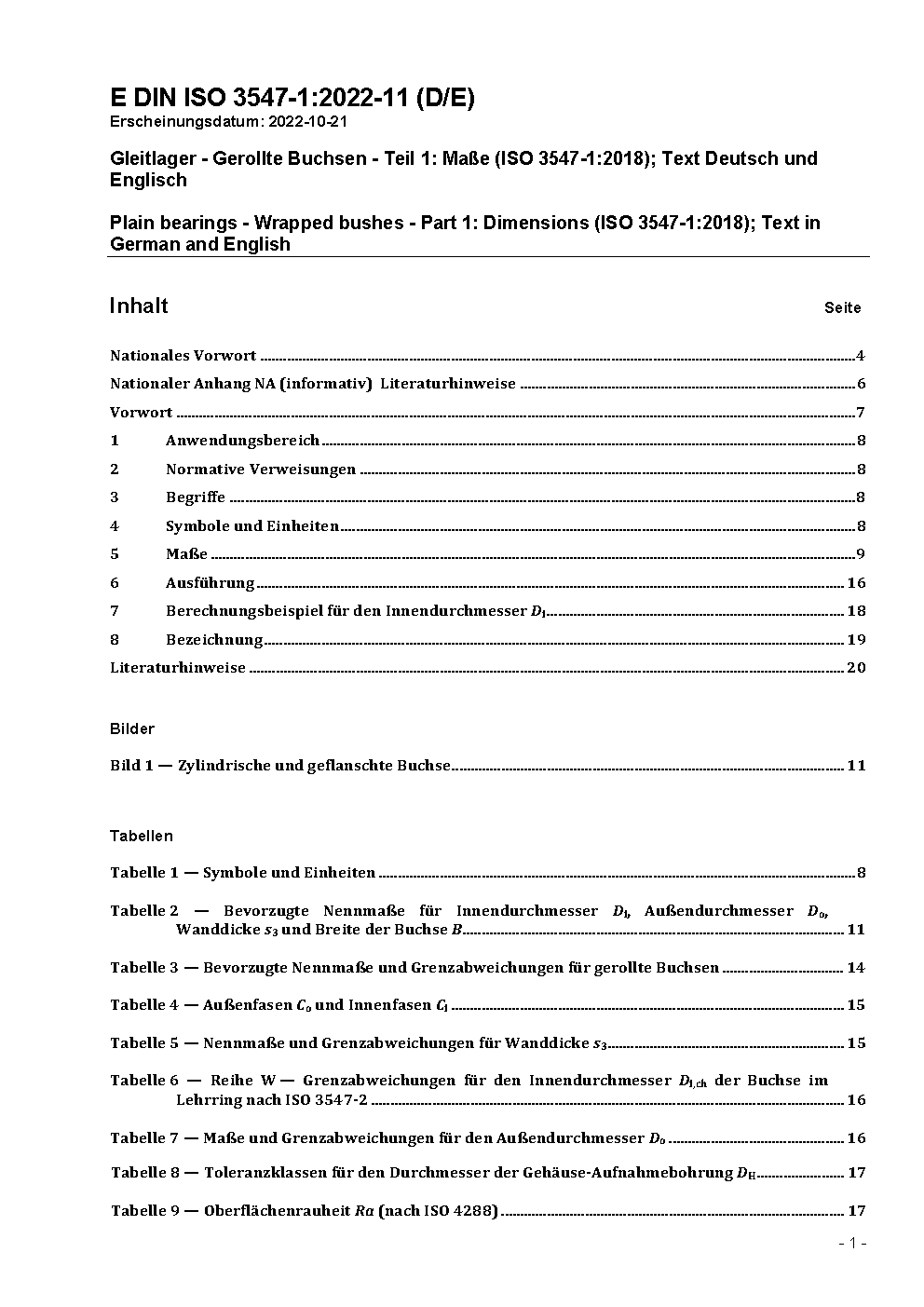 Gleitlager - Gerollte Buchsen - Teil 1: Maße (ISO 3547-1:1999)