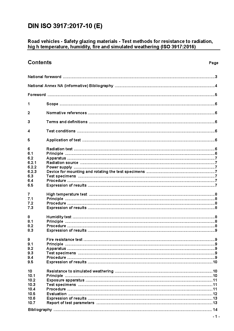 Road vehicles - Safety glazing materials - Test methods for resistance to radiation, high temperature, humidity, fire and simulated weathering (ISO 3917:2016); Text in German and English