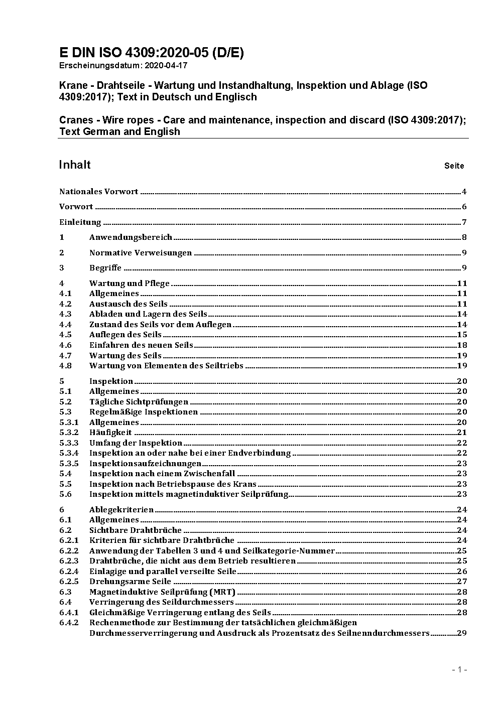 Krane - Drahtseile - Wartung und Instandhaltung, Inspektion und Ablage (ISO 4309:2010)