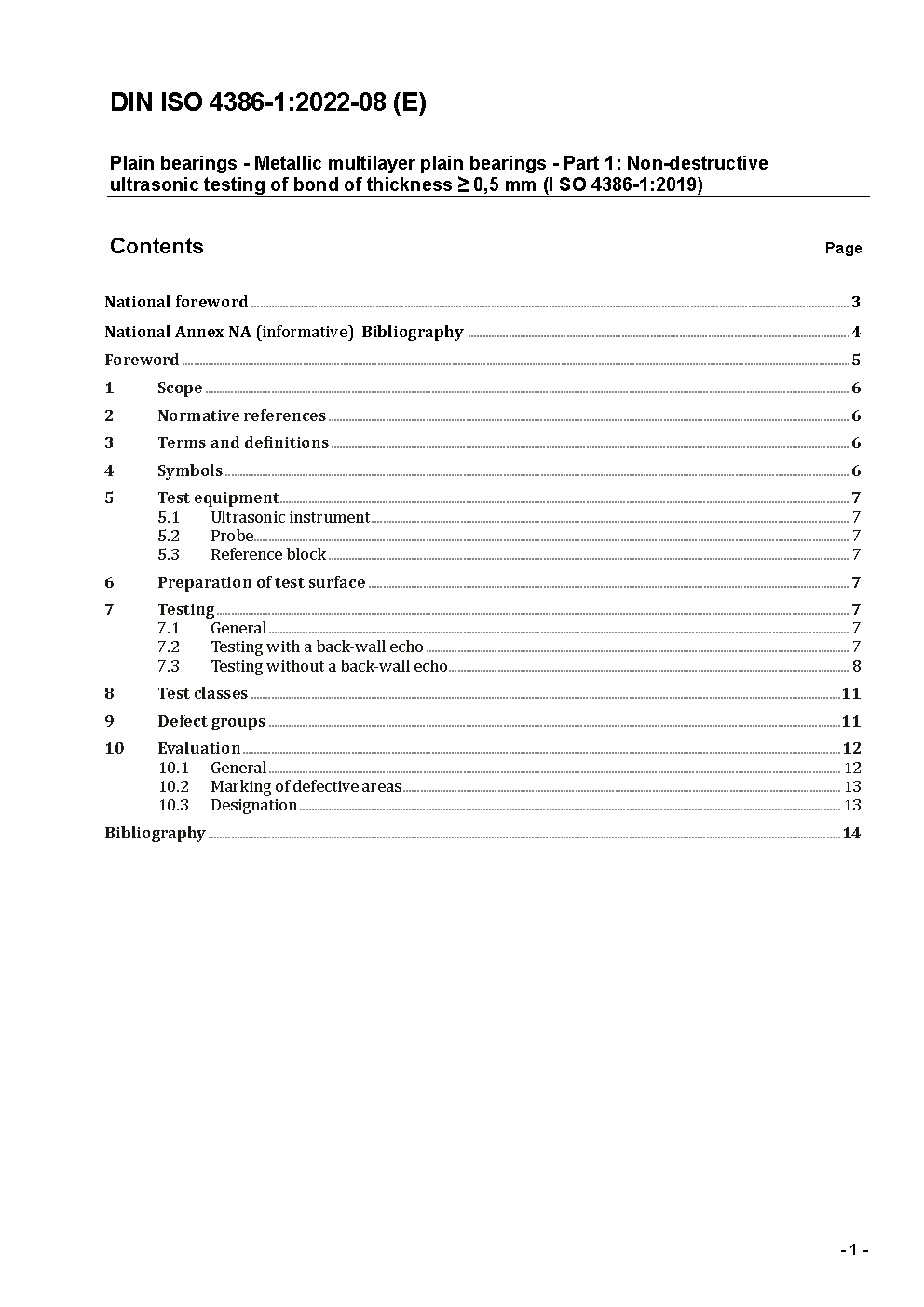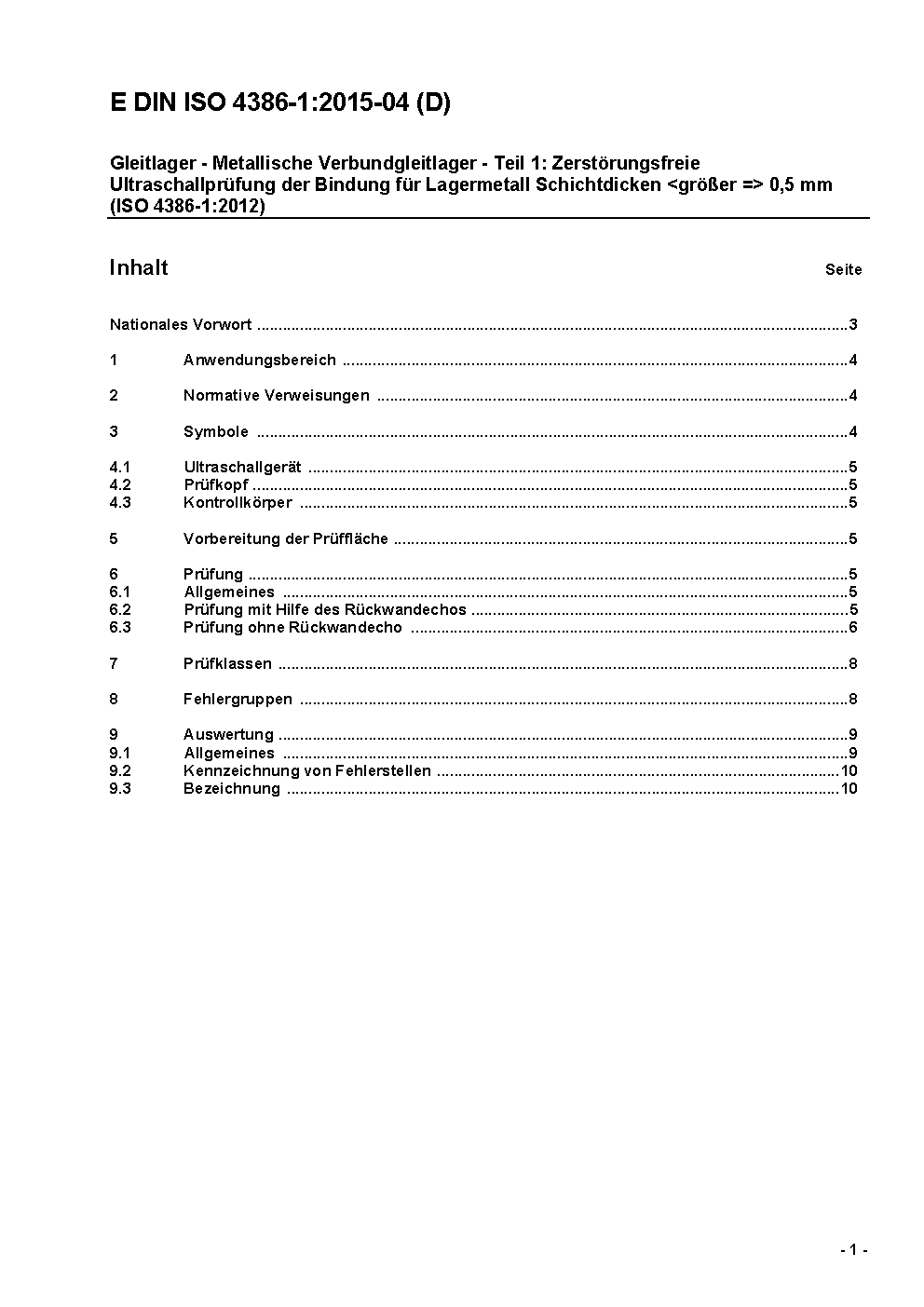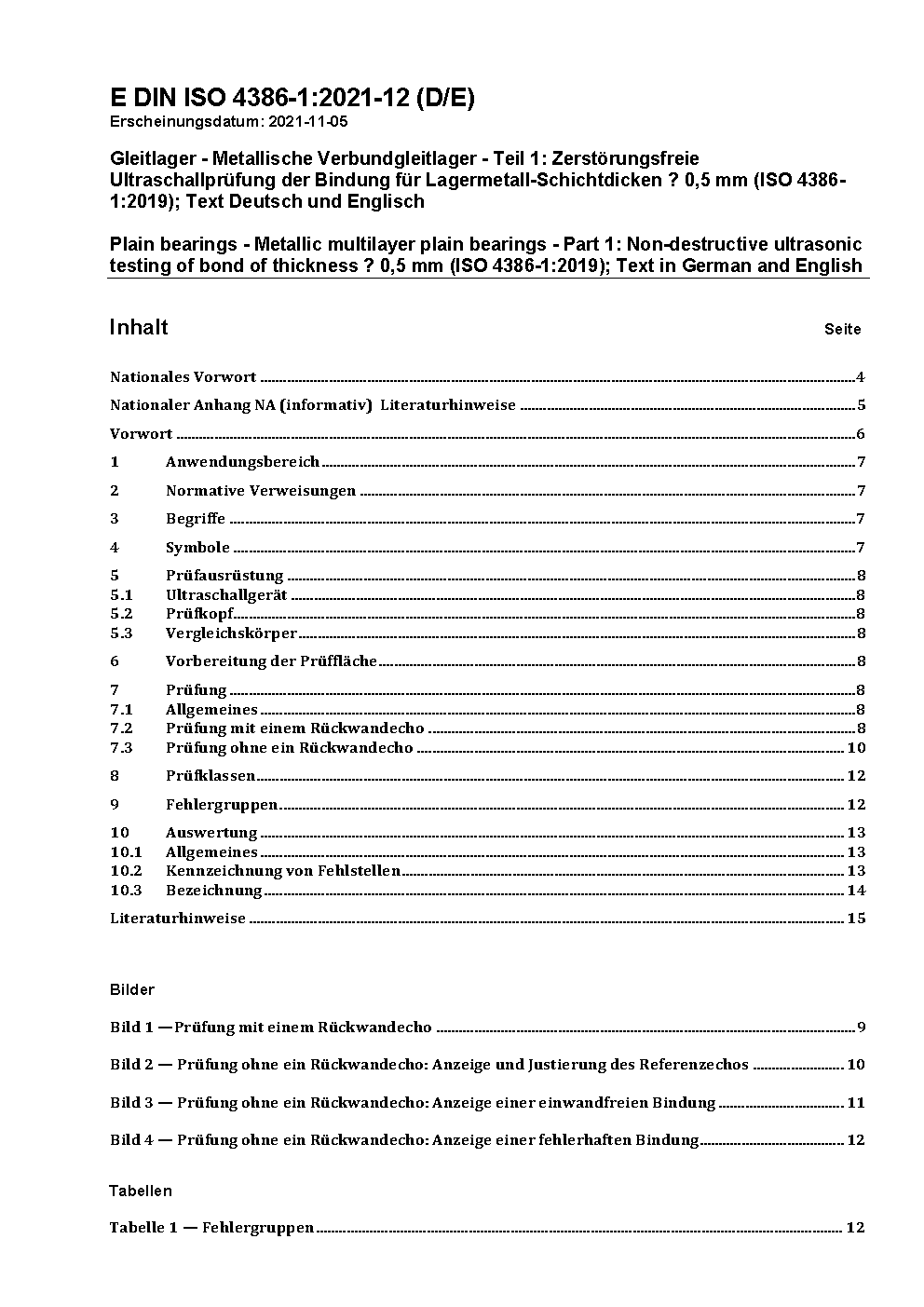 Gleitlager - Metallische Verbundgleitlager - Teil 1: Zerstörungsfreie Ultraschallprüfung der Bindung für Lagermetall-Schichtdicken 0,5 mm (ISO 4386-1:2019); Text Deutsch und Englisch
