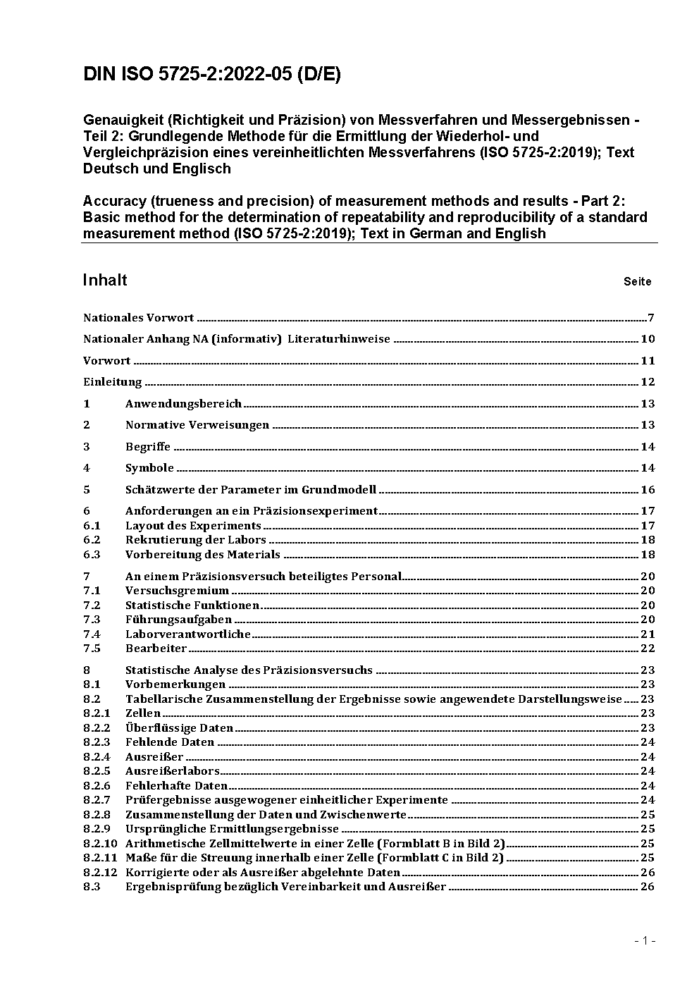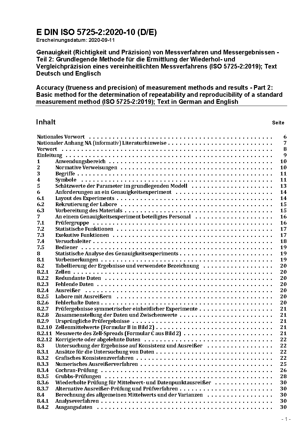 Accuracy (trueness and precision) of measurement methods and results - Part 2: Basic method for the determination of repeatability and reproducibility of a standard measurement method (ISO 5725-2:2019); Text in German and English