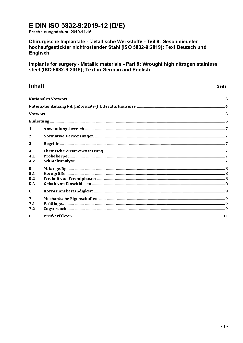 Chirurgische Implantate - Metallische Werkstoffe - Teil 9: Geschmiedeter hochaufgestickter nichtrostender Stahl (ISO 5832-9:1992)