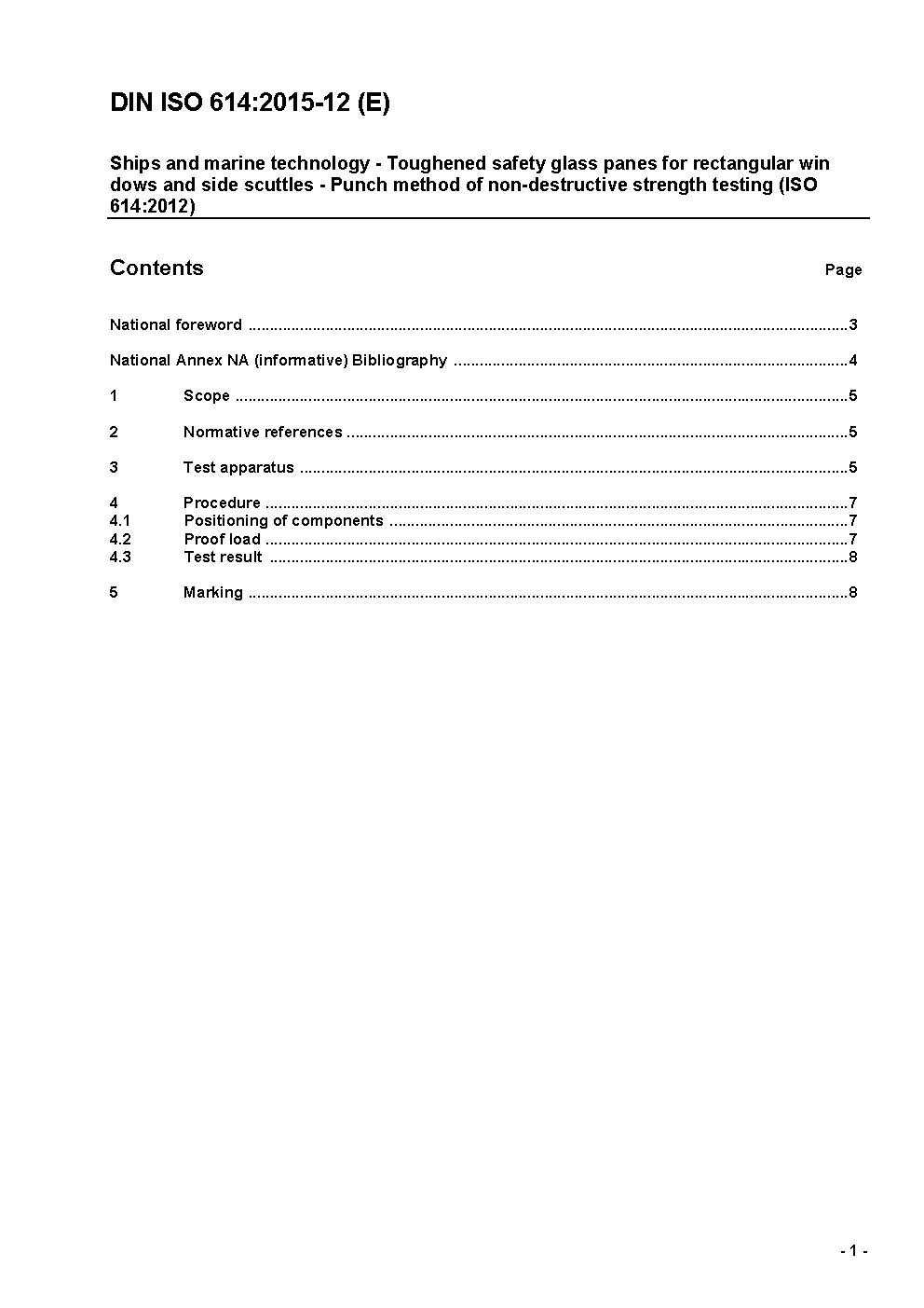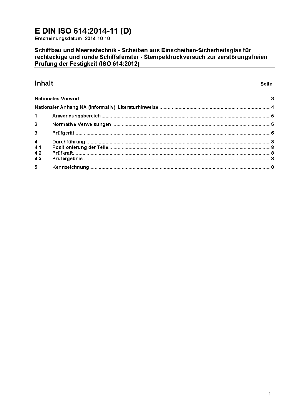 Schiffbau und Meerestechnik - Scheiben aus Einscheiben-Sicherheitsglas für rechteckige und runde Schiffsfenster - Stempeldruckversuch zur zerstörungsfreien Prüfung der Festigkeit (ISO 614:2012)