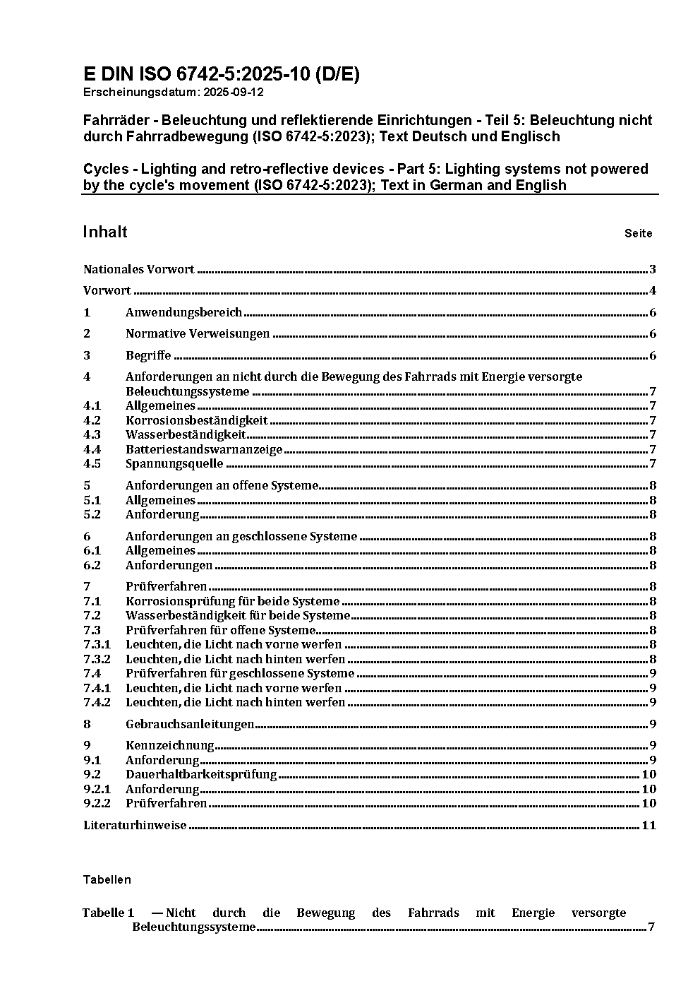 Fahrräder - Beleuchtung und reflektierende Einrichtungen - Teil 5: Beleuchtung nicht durch Fahrradbewegung (ISO 6742-5:2023); Text Deutsch und Englisch