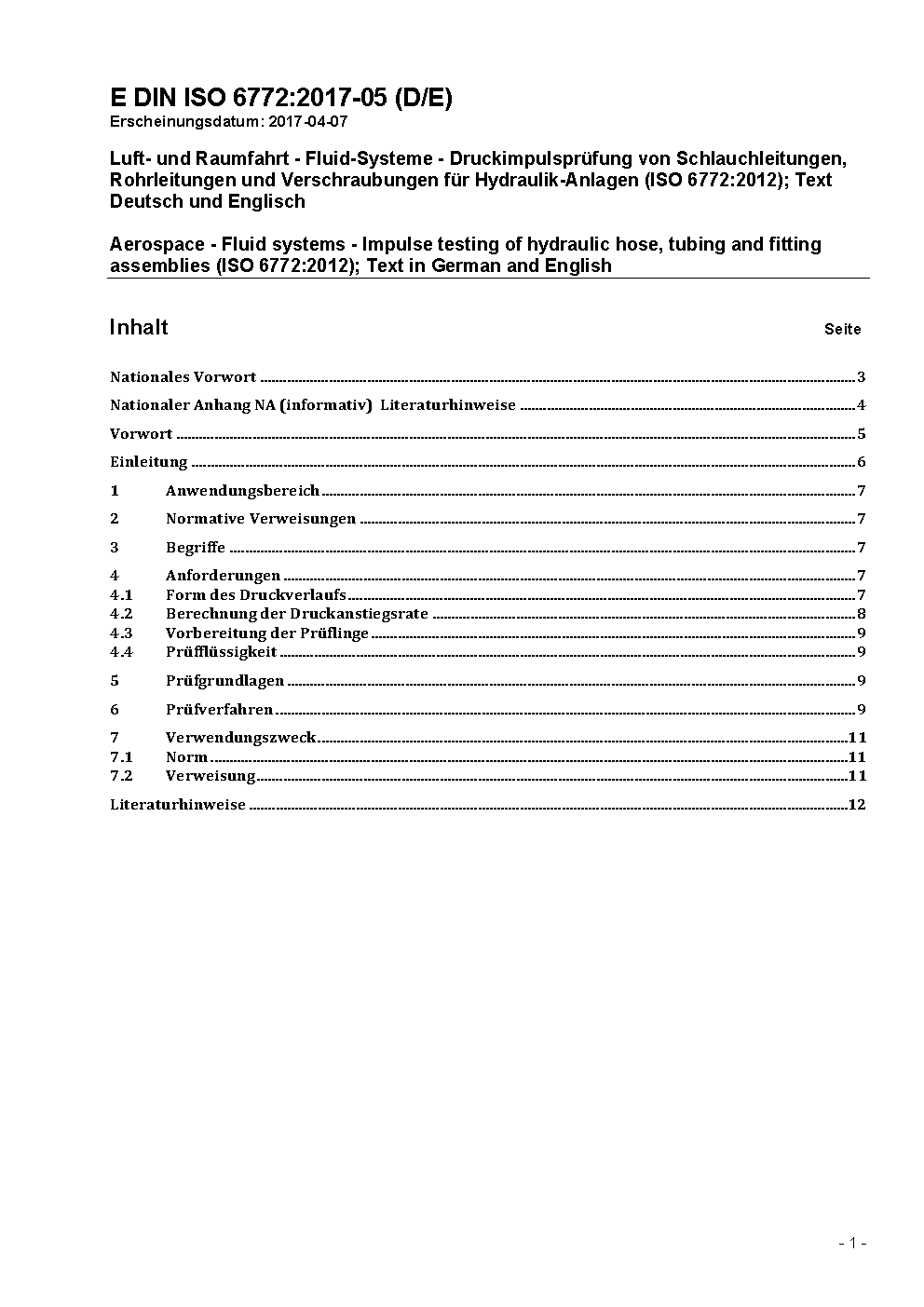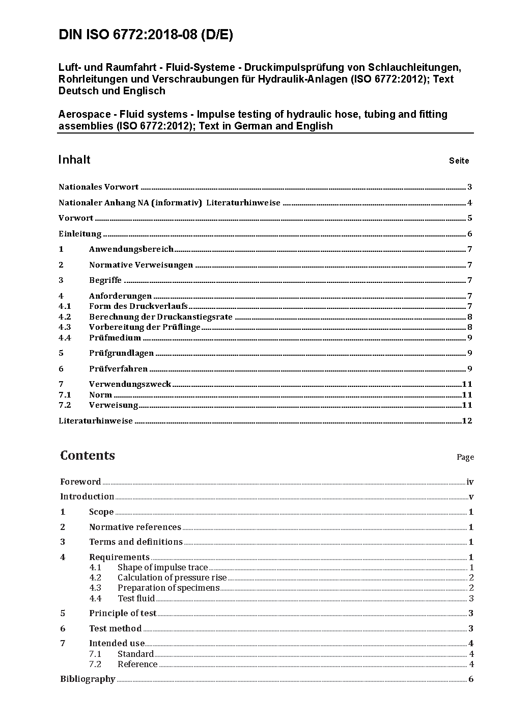 Luft- und Raumfahrt - Fluid-Systeme - Druckimpulsprüfung von Schlauchleitungen, Rohrleitungen und Verschraubungen für Hydraulik-Anlagen (ISO 6772:1988)