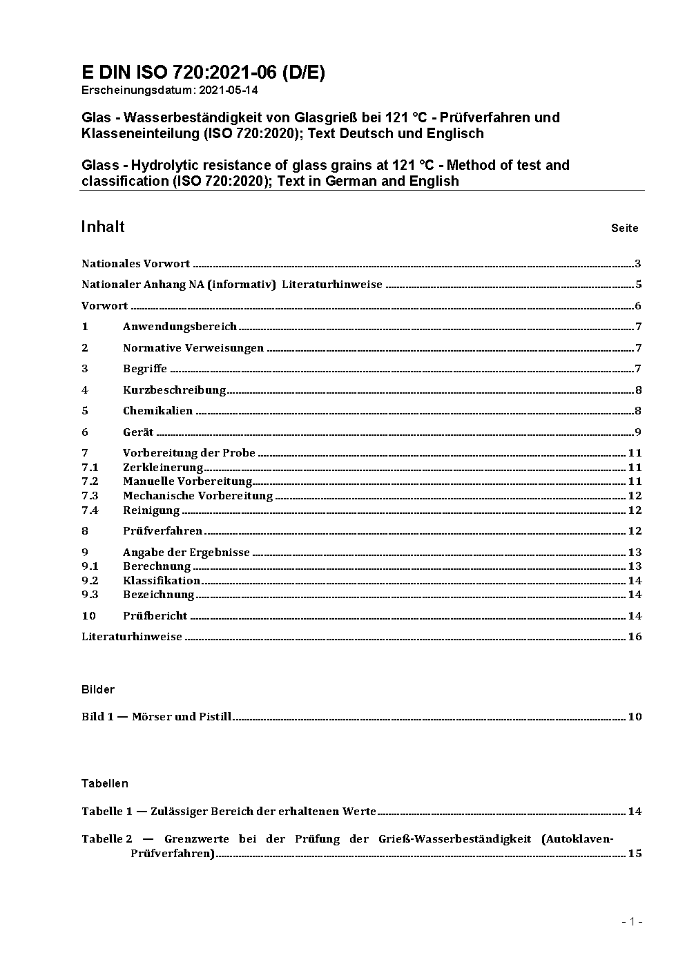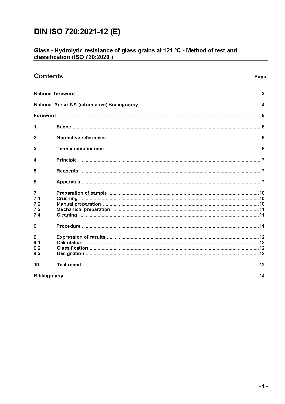 Glass - Hydrolytic resistance of glass grains at 121 °C - Method of test and classification (ISO 720:2020); Text in German and English