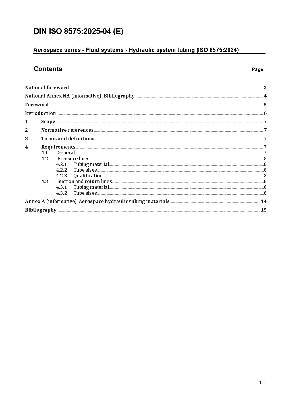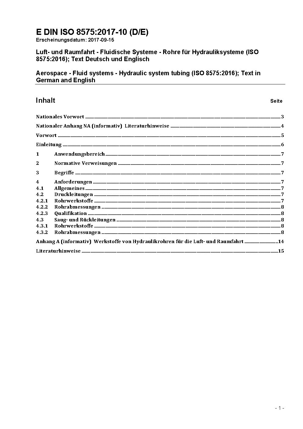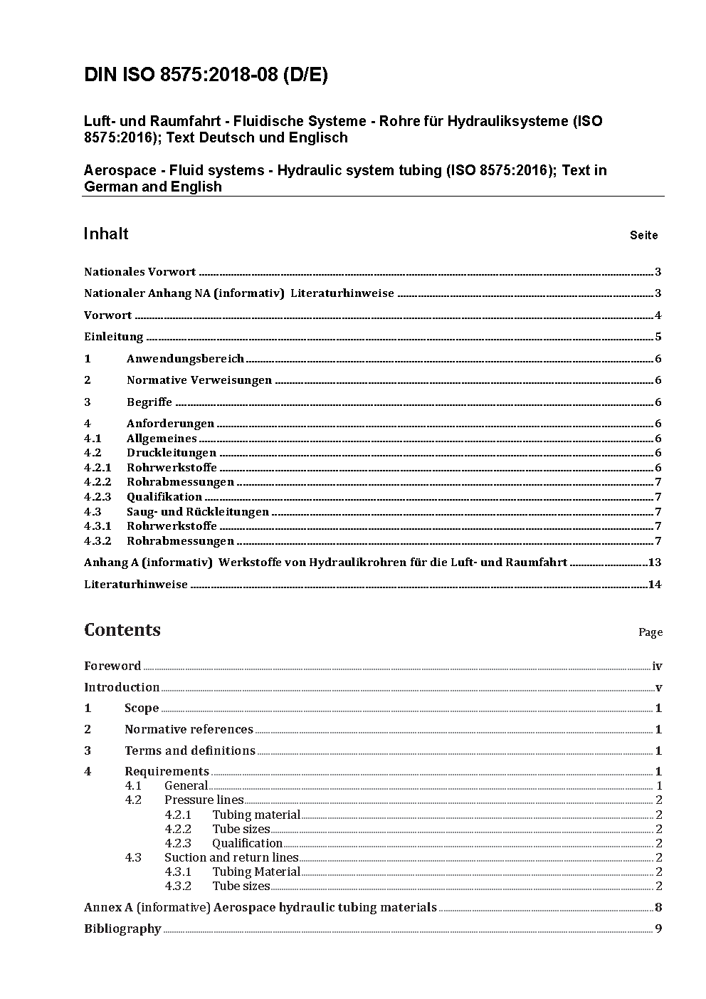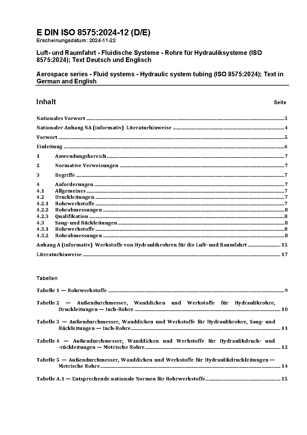 Luft- und Raumfahrt - Fluidische Systeme - Rohre für Hydrauliksysteme (ISO 8575:2024); Text Deutsch und Englisch